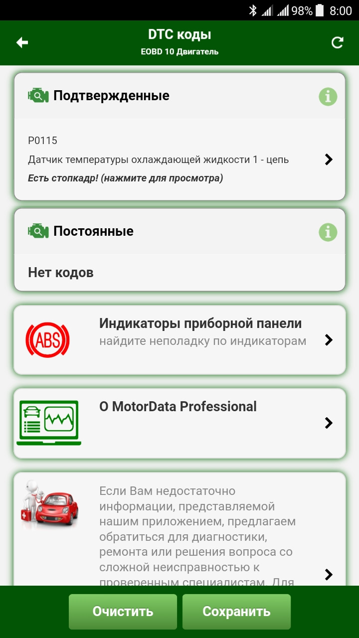 Привет ещё раз! Вчера машина стояла заведённая возле магазина где-то 20 минут, прогретая с включенным отопителем на 2 скорости.Вышел сел в машину начинаю движение проехал 50 метров загорается на приборке и не тухнет Chek, и на бортовике пишет что-то с двигателем, при этом стрелка температуры падает на нуль и обратно поднимается на середину, примерно на 70°С.Глушу машину постояв не много, завожу и сразу снова бортовик пищит и ошибка Chek.Проехав с чеком примерно 8-10 км, чек с приборки потух.Надоело ездить и брать у знакомой ноутбук для диагностики.Поехал и купил себе блютуз ELM 327.Вещь отличная! Прогу скачал на андройд MotorData OBD, воткнул ELM 327 в разъём, подключился и сразу всё проверил и считал ошибку и стёр её.Если кто знает . что за тест на выбросы, можно-ли доверять программе, на самом -ли деле там плохой катализатор ?