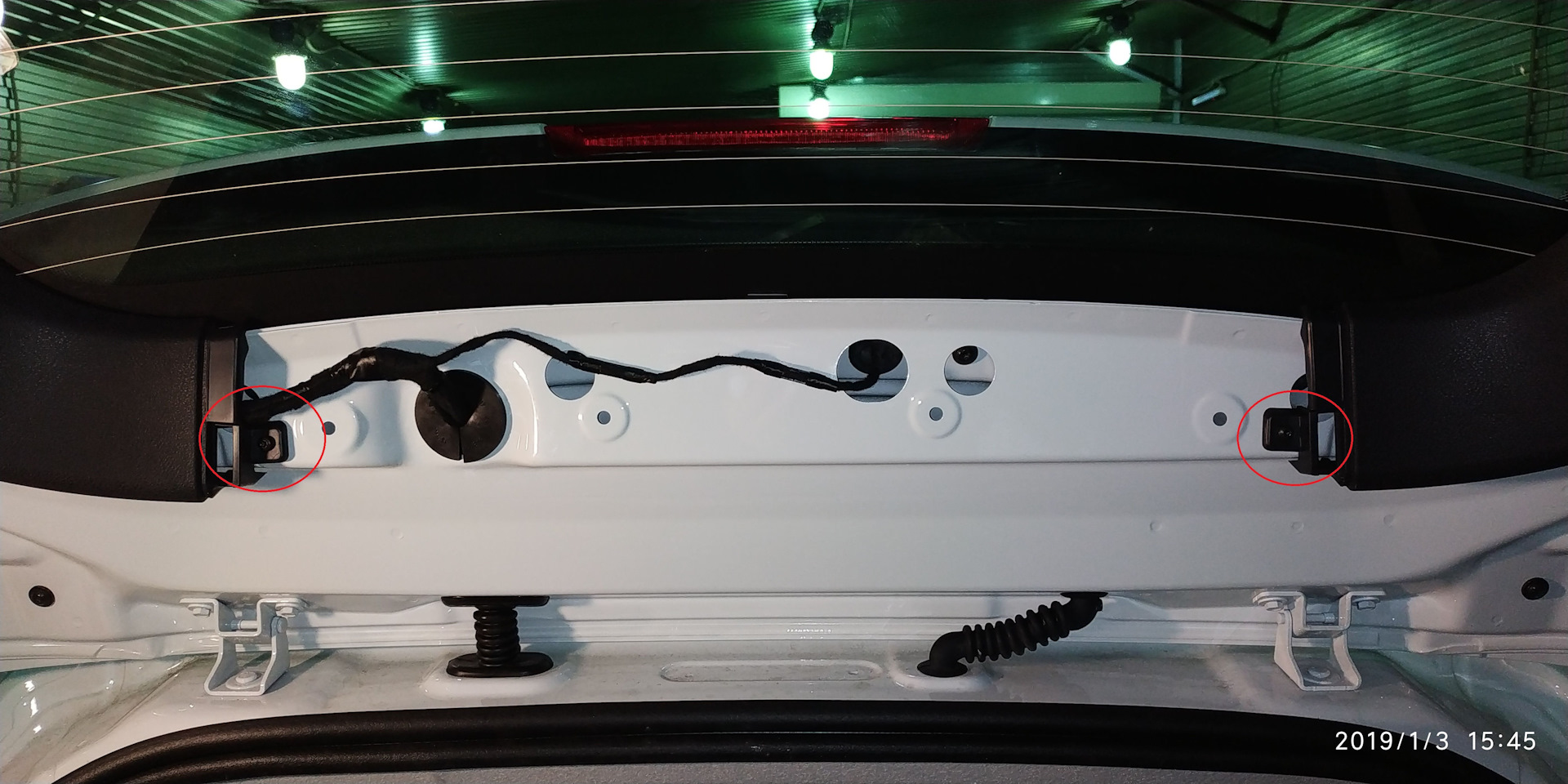 Снимаем дальнюю центральную накладку, отщелкиваем как на фотоОткручиваем 2 болтаЦентральная дальняя накладкаОтщелкиваем боковые накладки2 клипсы, при установке обратно их нужно проверить, чтобы не сместилисьОткручиваем с 2-х сторон эти саморезыУбираем все заглушки и выворачиваем в ручках по 2 болта с каждой стороны, затем сдергиваем панель с защелокЗащелки на центральной накладкеВыкручиваем 6 гаек на 8, чтобы снять панель с подсветкой номера и кнопкой открытия багажника для установки в нее камеры.Сдвигаем синий фиксатор вверх и нажимаем на черный язычок и только затем выдвигаем разъем.Врезаем камеру