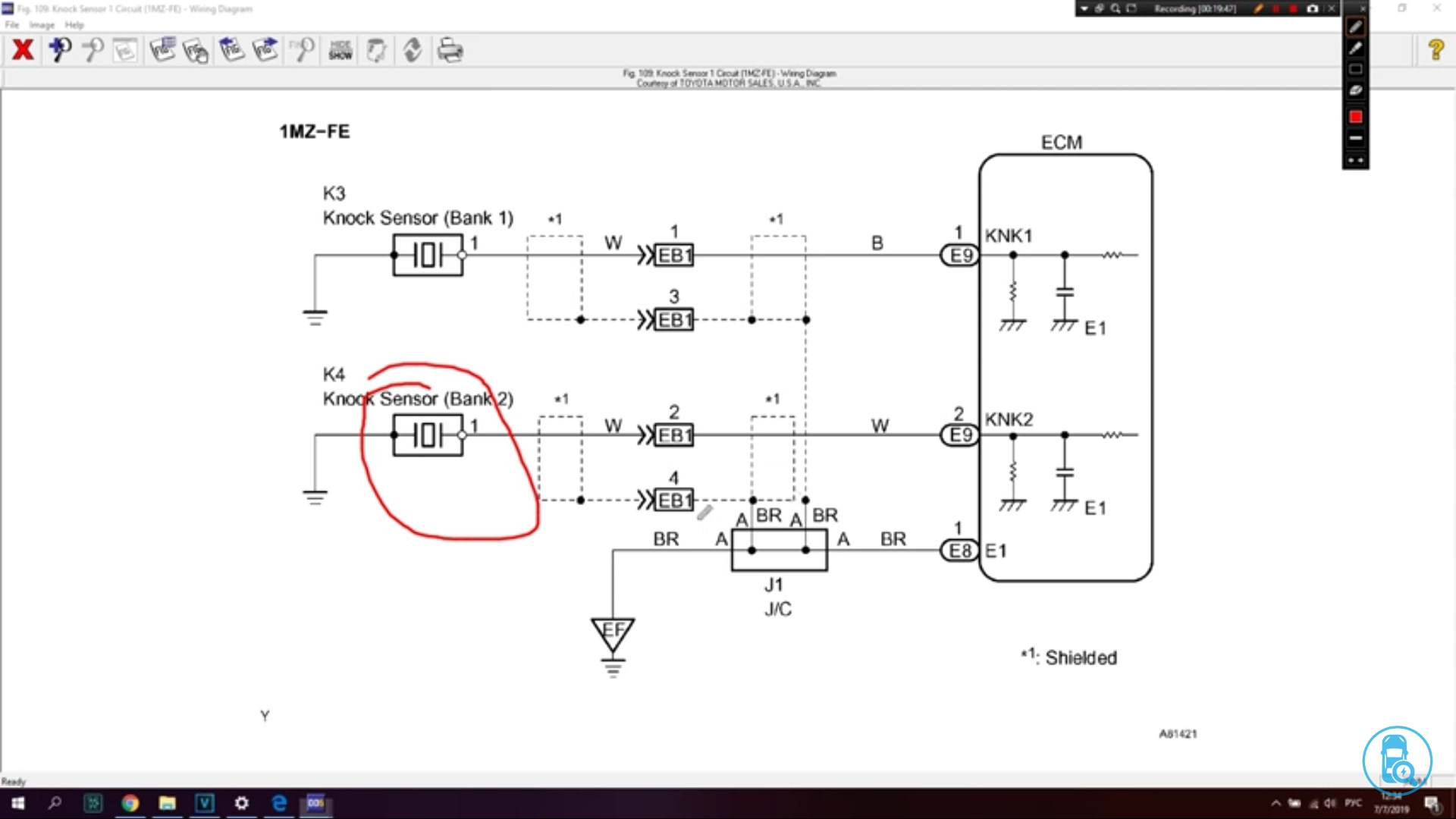 В чем суть проверки…от каждого датчика детонации в ЭБУ заходит по одному сигнальному проводу. Оплетка экранов этих проводов соединяется в специальном разъёме со всеми экранами других датчиков возле ЭБУ и замыкается на «массу» общим проводом и заходит в ЭБУ одним проводом.