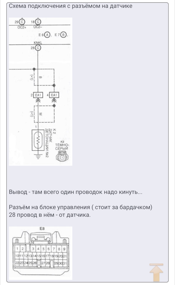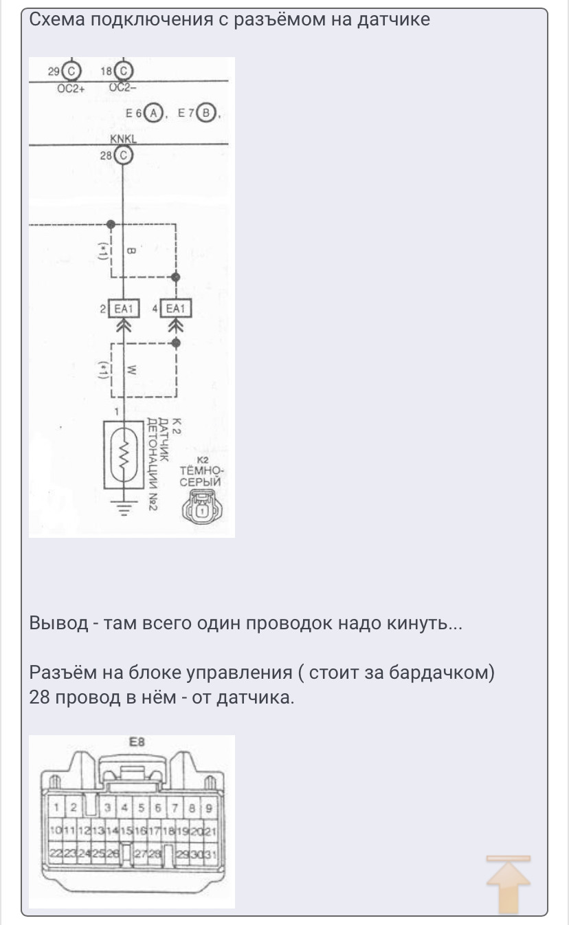 Нас интересуют именно сигнальные провода. На схеме эти сигнальные провода обозначены, как 27 и 28 контакты в разъёме Е9 ЭКУ. 27-й контакт разъема Е9 — это провод датчика детонации 2-й головы (ближней к бамперу) и он в изоляции чёрного цвета. 28-й контакт — провод датчика детонации 1-й головы (ближней к моторному щиту) и он в прозрачной изоляции.
