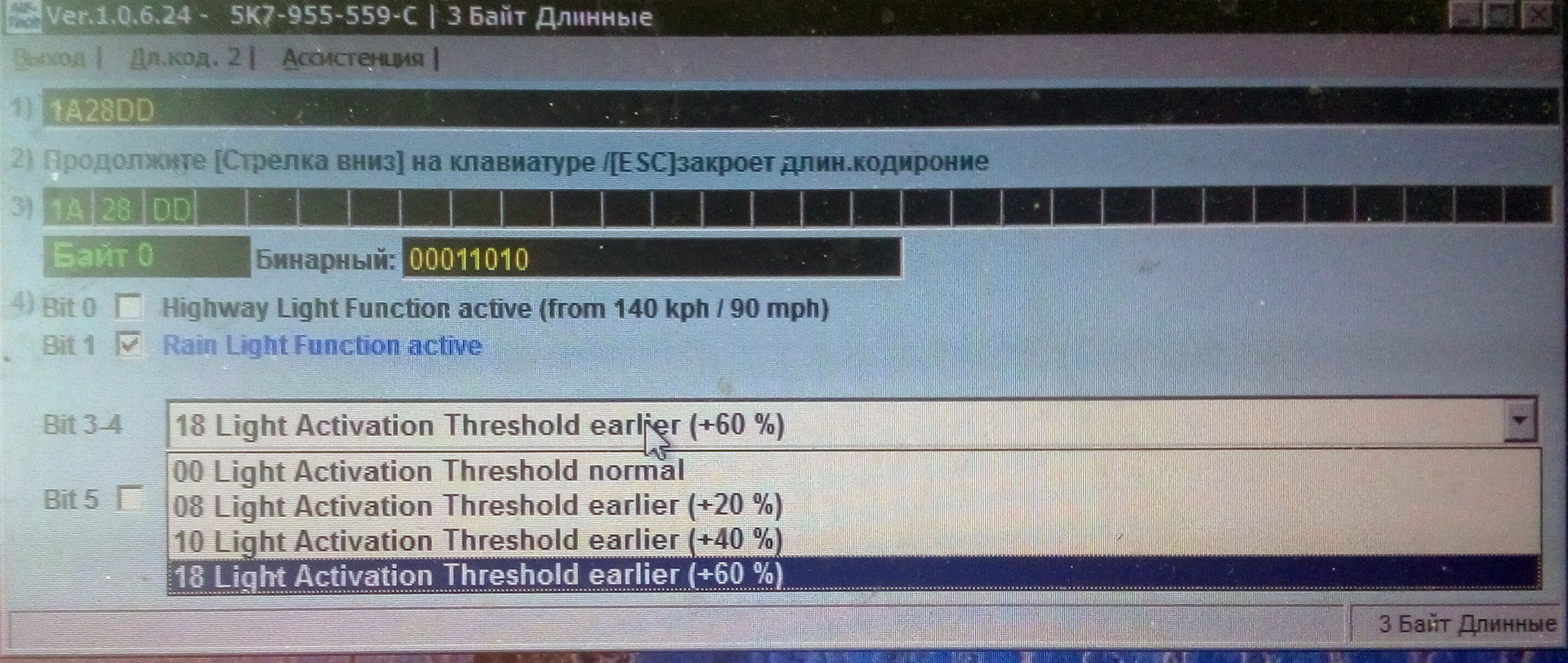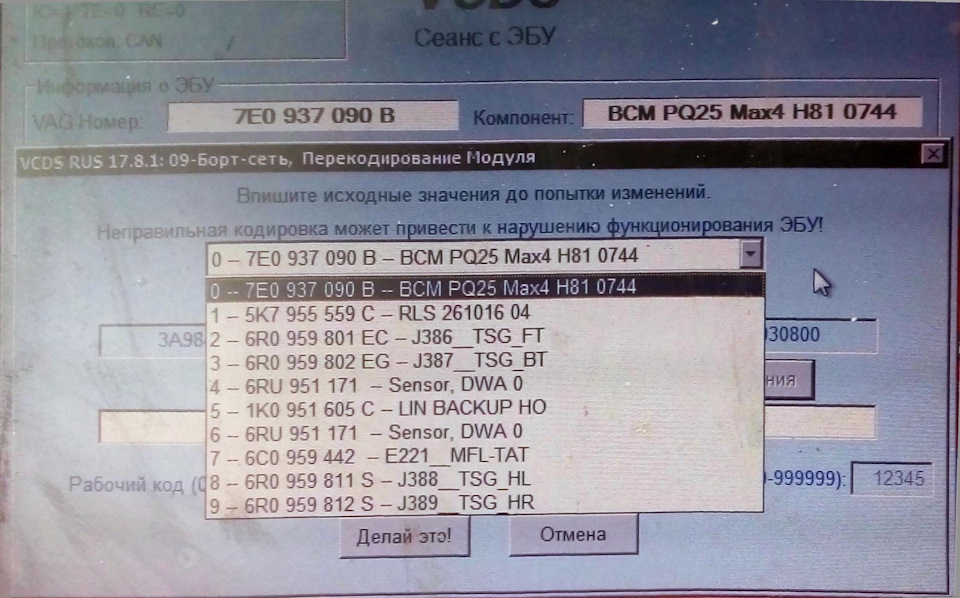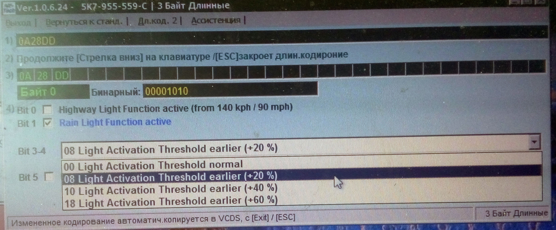 ЗЫ: VCDS не смог изменить этот параметр (чёто глючный) менял VAS5054 но там нету описания, поэтому вбивал руками глядя на кодировку из VCDS.