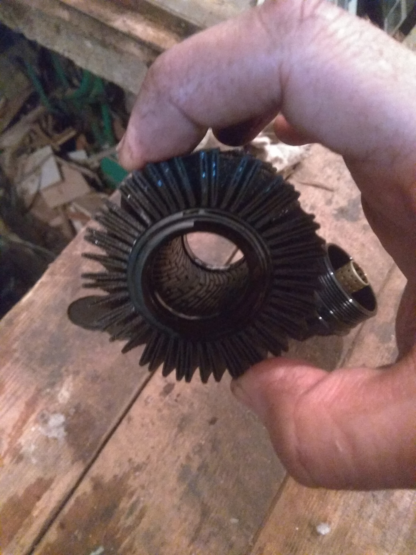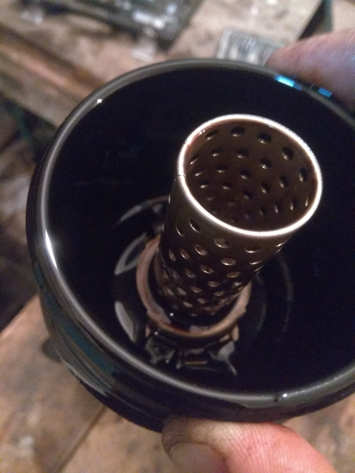 Для этой пробки у меня спец кокса не оказалось но было что-то похожее и при помощи шлиф диска ключ был изготовлен и широкого шестигранника! Подошёл новый самодельный ключ на ура! Не не тут то было открутился у меня на этот первый крышка клапан, а корпус фильтр целиком! Кстати масло пролилось не так уж и много и вовремя представленная посудина не позволила вылиться маслу в яму) Изучив корпус фильтра когда он был уже извлечён пришел к выводу: Походу эту нижнюю крышку для стравливания масла так и до меня никто и не откручивал.