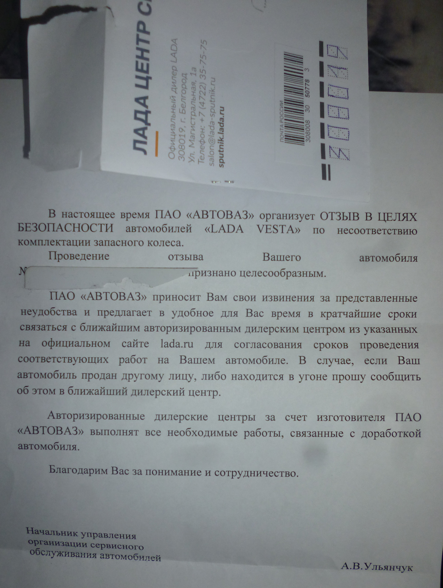 Получил сегодня заказное письмо от Авто Ваза, ребята там решили замутить отзывную компанию, здесь слышал от драйвовчан про неё, но не думал что всё настолько серьезно чтобы лично каждого вызывать заказными письмами. И до сих пор не пойму в чём опасность того что диск покрашен в тот же цвет что и остальные колёса.