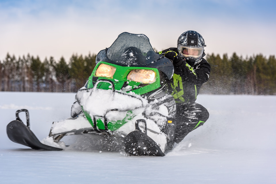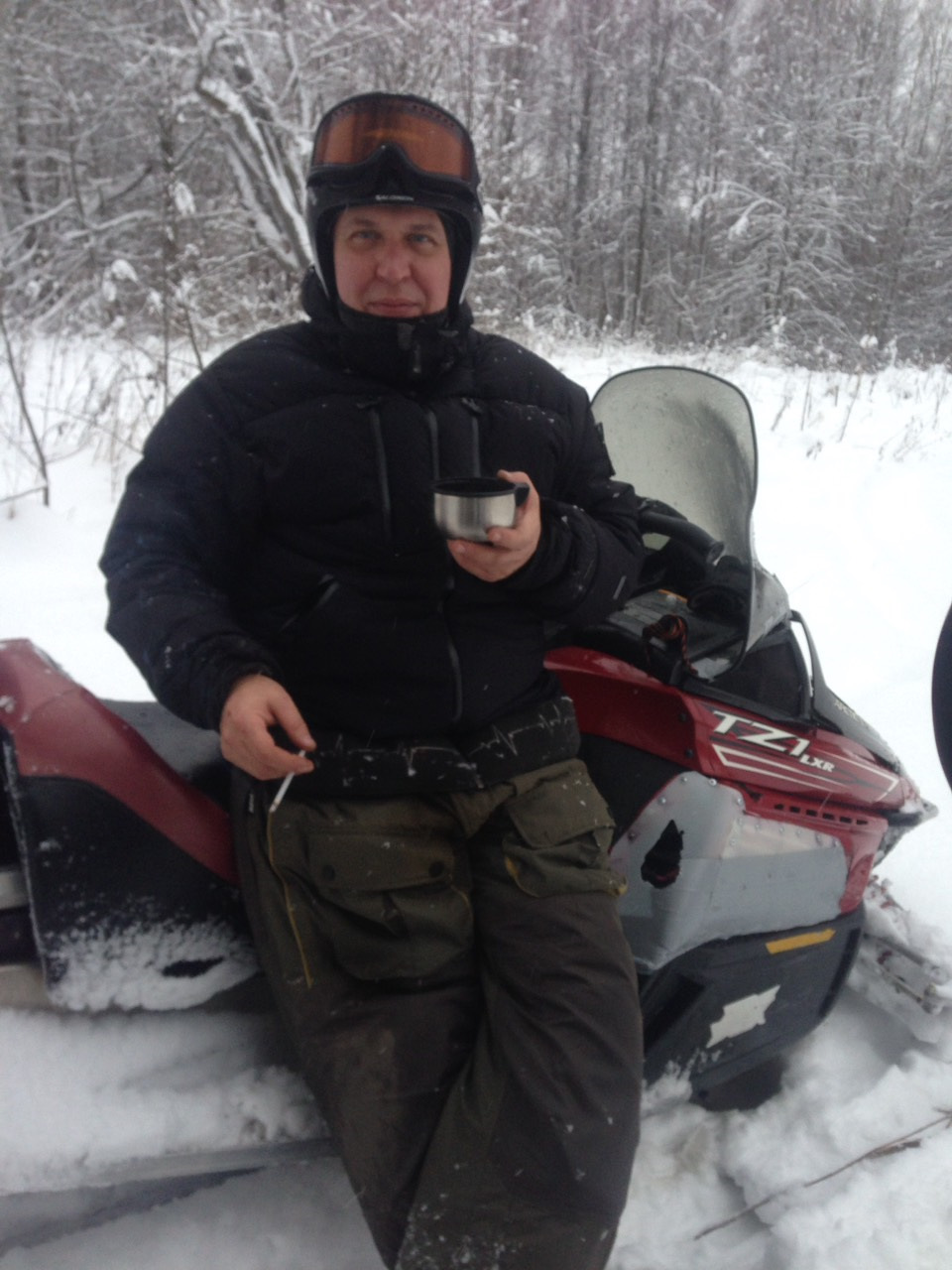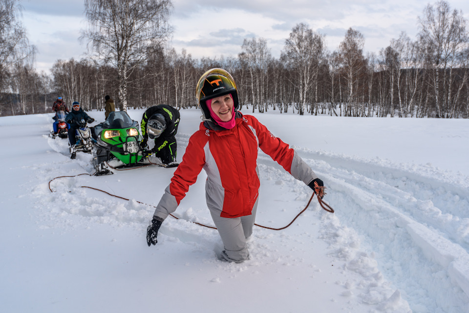 Пока на скорости идет — не проваливается. Гусеница у него действительно слишком коротка и узка для двоих по глубокому снегу. Одного хорошо держит.