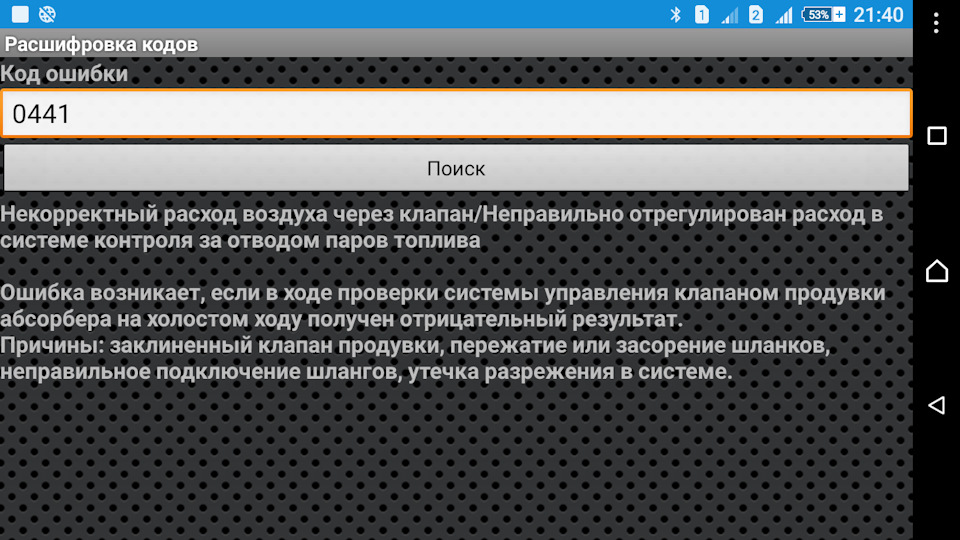 Ошибка P0441" Неисправность системы продувки абсорбера "