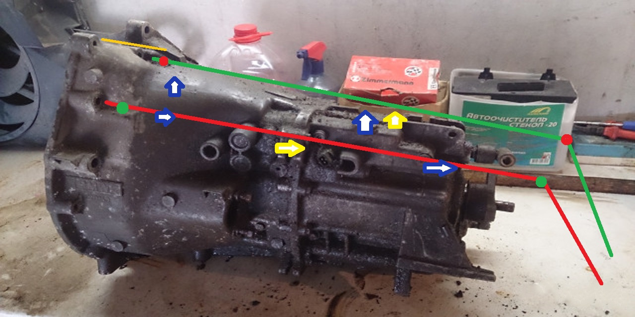 Желтые стрелки — где держал я, откручивая это дело в одну персону. Стрелки вверх означают что придерживать нужно вверх, стрелки вправо подразумевают, что выравнивать нужно вдоль ДП, как бы придавливая ось ключа ближе к коробке. Если один болт (красная линия) вы из ямы увидите, то второй "брать" придется вслепую. Для этого рукой коробку необходимо как бы обхватить, дотягиваясь к ДП. Там есть углубление, вы почувствуете его и нащупаете болт. Рекомендую аккуратно подбить головку через удлинители, чтобы лучше села на болт и мы случайно не сорвали шлицы.