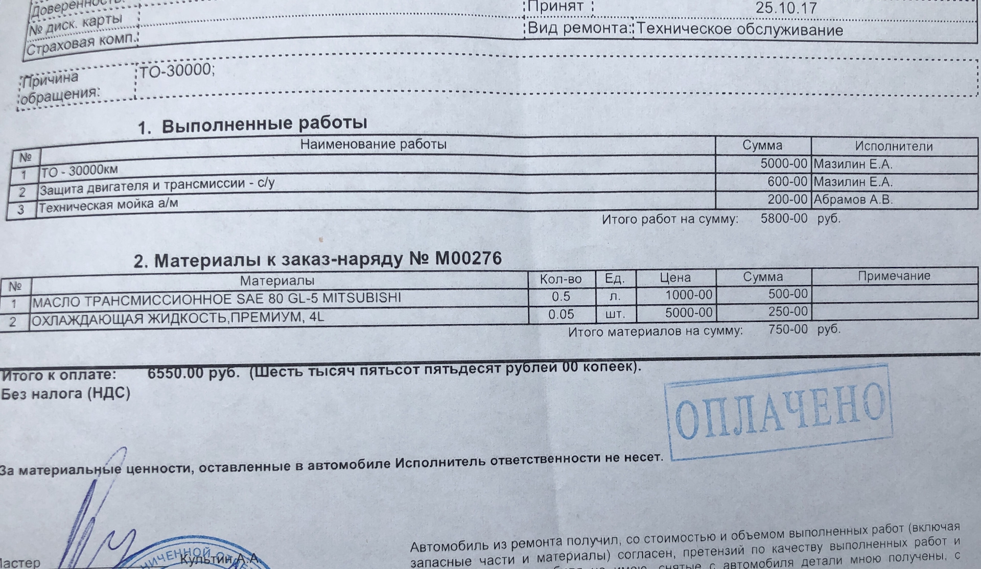 В общем и целом на все работы ушло всего лишь 1 час 45 мин. Довольно быстро на мой взгляд. Итог по стоимости составил 6550 руб. За жидкость ГУР вообще ни копейки не взяли. Выдали новую карту, проводили до машины, пожелали счастливого пути.