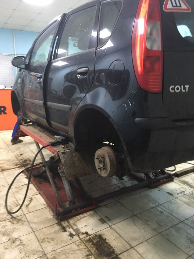 С кольтом сразу же всплыло несколько проблем, но обо всем по порядку. Сделав с некоторыми трудностями страховку (если интересно, могу описать по подробнее), я поехал на машине к себе домой в Петергоф. Это примерно 50-60 км из Пушкина. При наборе скорости больше 40 км/ч появлялась сильная вибрация, машину сильно колбасило. Первая мысль — наверно диски кривые. Я как-то не обратил внимания, что со слов моего начальника, она стояла на зимней резине уже 2 года без движения. Несмотря на это, колеса почти не спустило и подкачка до рекомендованных 2.2 атм перед началом движения заняла не более 5 минут.