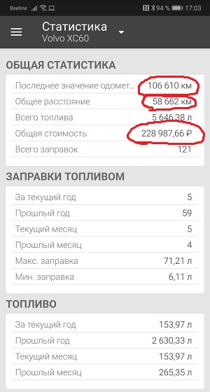 Как и начинал я, так и продолжил и все затраты на авто подробно вел в программке для смартфона Fuelio — она меня вполне по функционалу устраивает. Далее несколько скринов из нее.