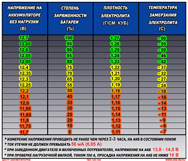 Табличка по которой можно определить степень заряженности аккумулятора от напряжения на клеммах: