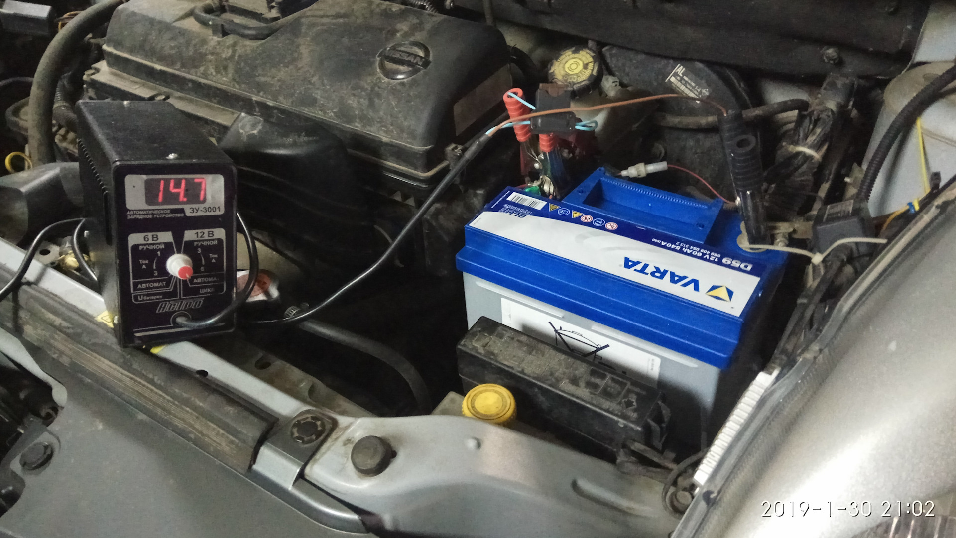 Второй раз, повез жену в больницу 26.12.2018 г. — вышли из здания, машина не завелась вообще, позвонил товарищу, прикурили, поехал в гараж — поставил заряжаться на 14 часов, потом вроде нормально заводилась.