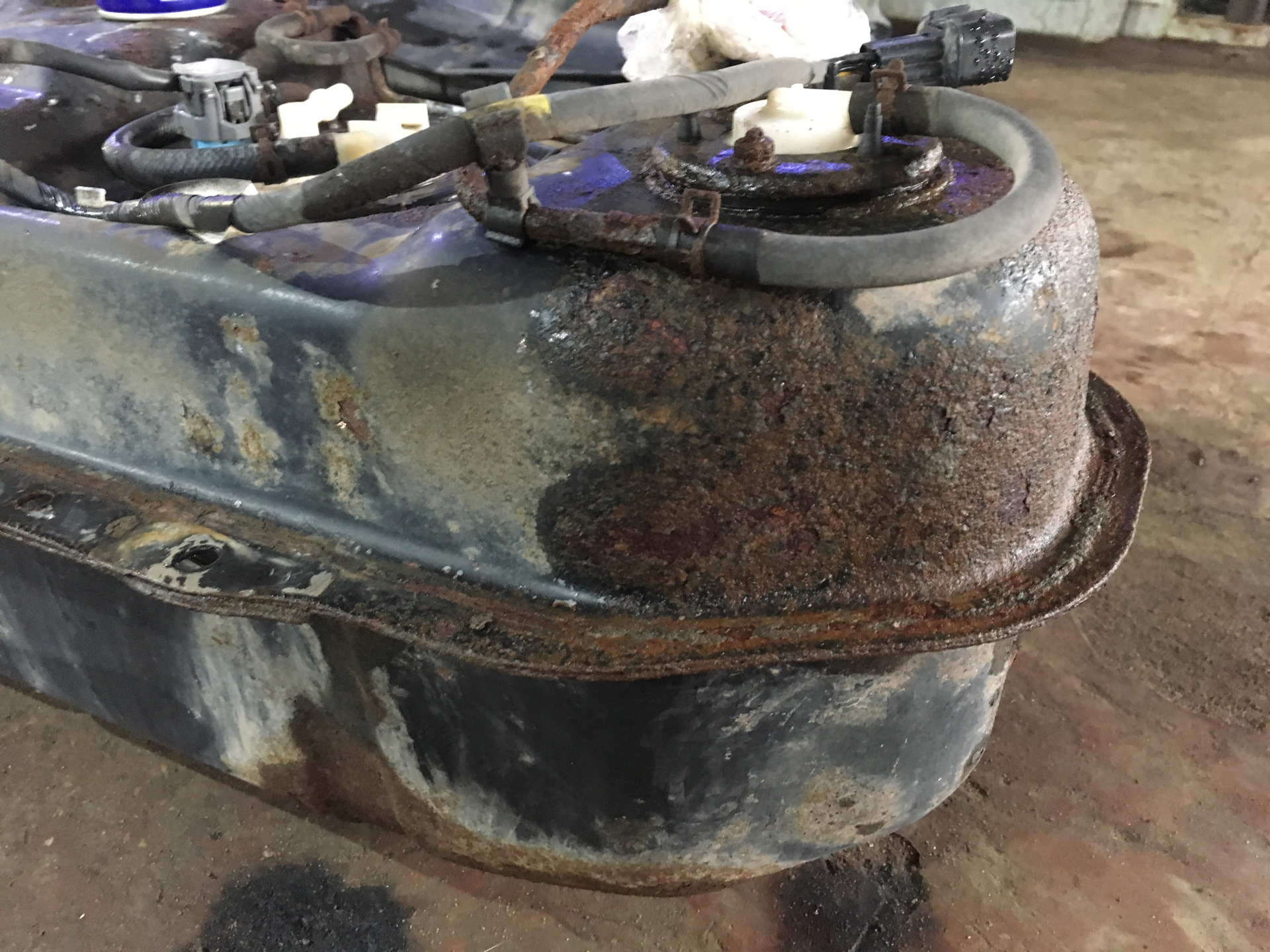 Задумался о замене топливного фильтра, хоть и езжу на газу, но не знал кто когда его менял, фильтра заказал масума, так же колечки уплотнительные. Залез в лючок, а там закисло все, отмачивал вдшкой 2 недели, и все равно сорвал один болтик, начитавшись про гнилые баки решено было снять бак, вот что я увидел. На снятом баке вытащить насос оказалось проще, все болтики открутились. Бак зачистил, облил химией и антигравием. По ощущениям фильтр не меняли совсем или очень давно.