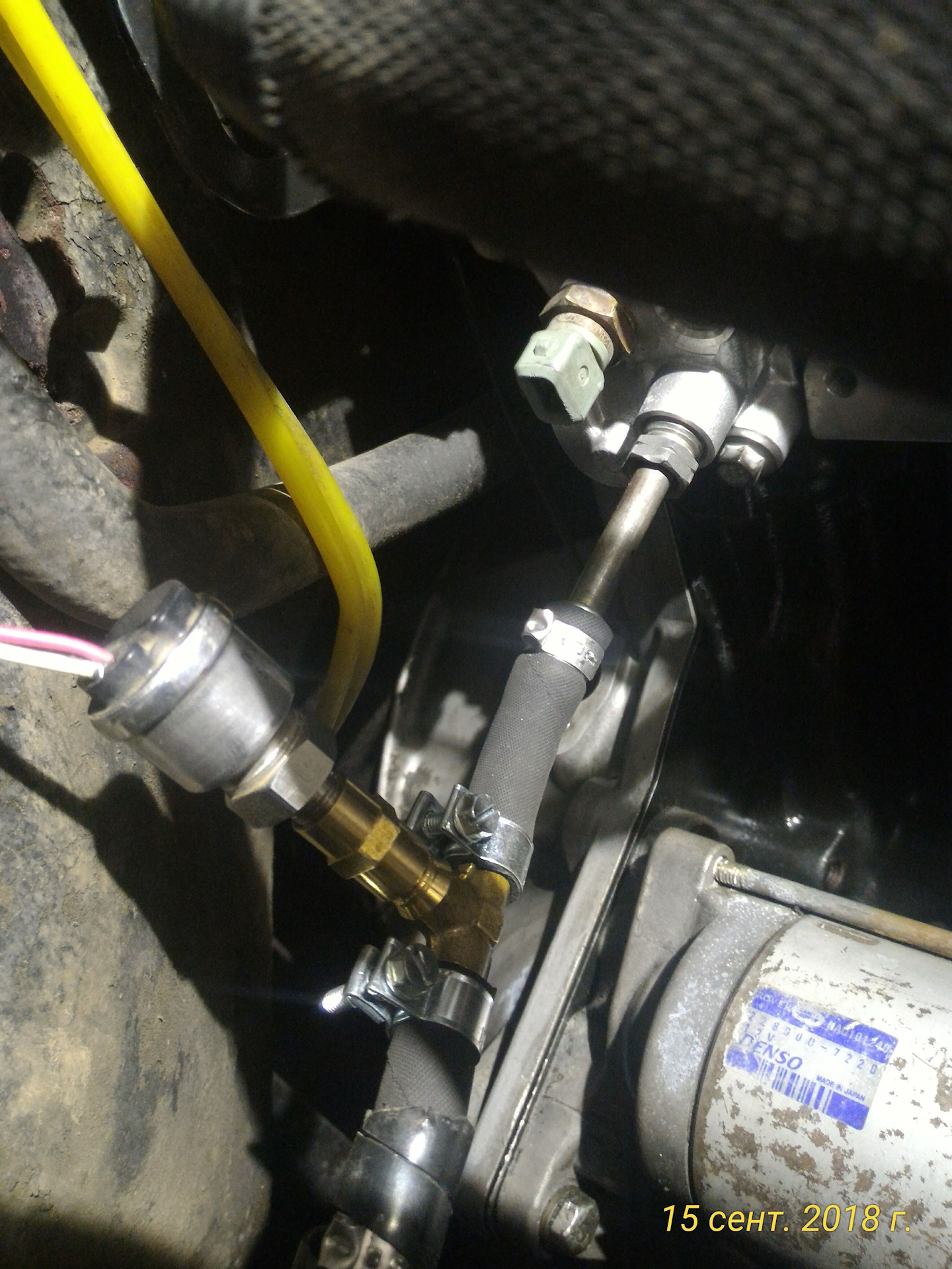 4) сенсор температуры охл.жидкости врезал в разрез штатной трубы при помощи приваренной гайки к подобранному (в автокрепеже)тройнику.