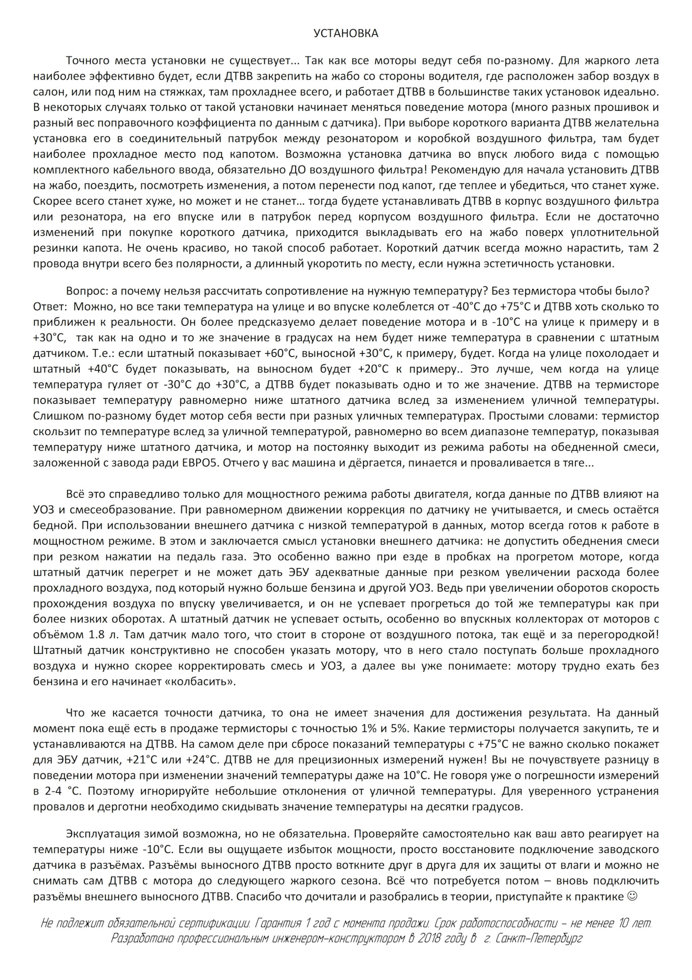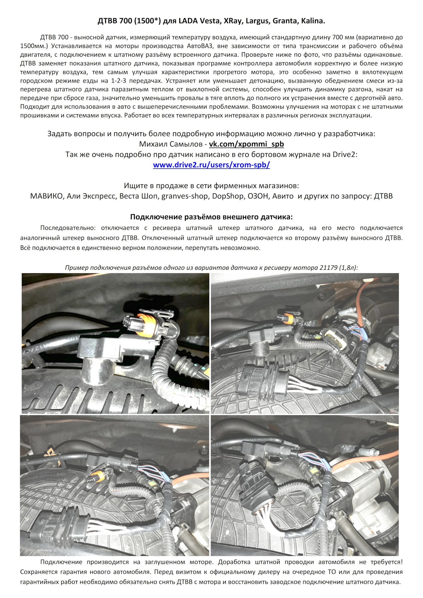 Ответ: У нас в коллекторе датчик температуры воздуха и датчик абсолютного давления объеденины в 1 корпус и имеют общий разьём и общий провод массы. Поэтому на внешнем дтв 2 разъёма что бы оставить питание на датчике давления, но отцепить от него дтв. Внешний дтв цепляется в разрыв цепи. Встает между разомкнутыми разъёмами. Схемы смотри тут — www.drive2.ru/l/520357622814081346 Это была пробная первая сборка внешнего дтв, установленная сейчас на Пумушке™ у antraks и его отзыв о работе датчика — www.drive2.ru/l/523169074046311724/