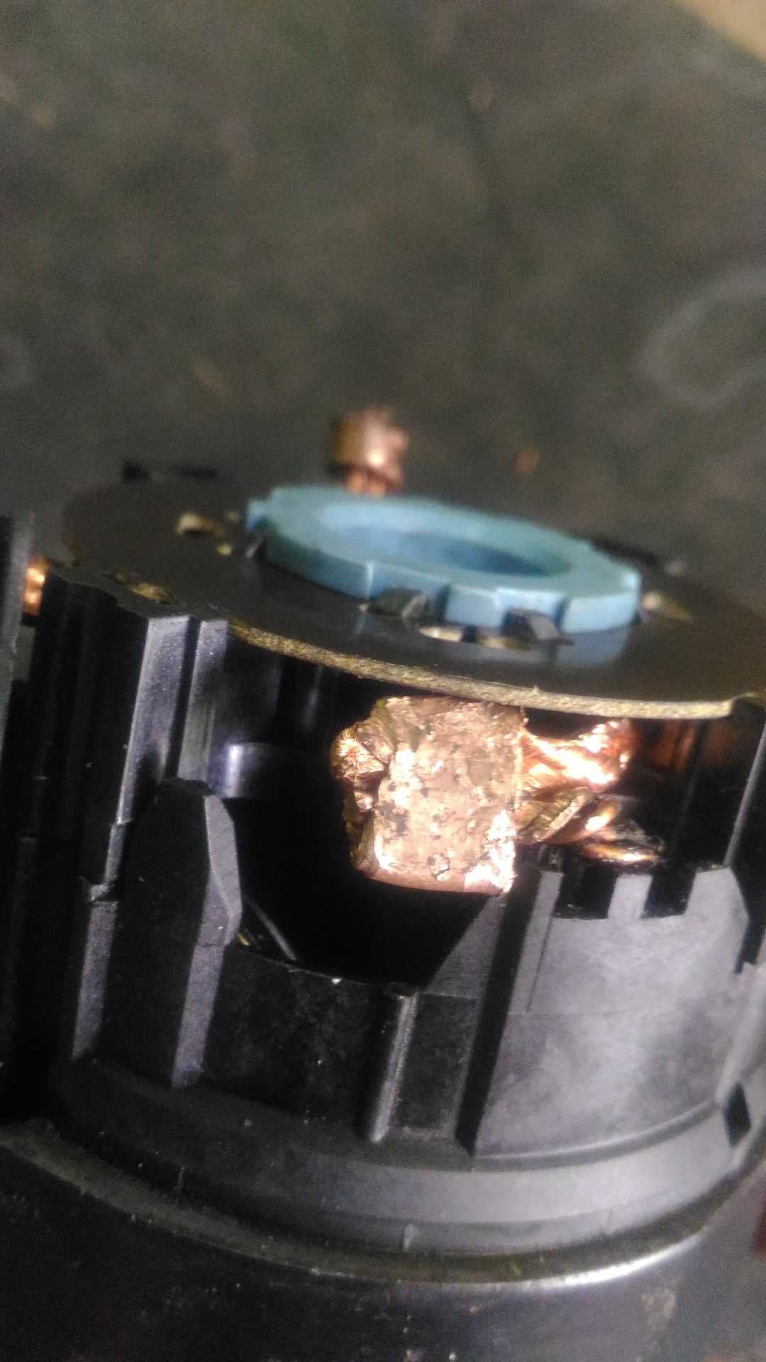 Две щетки из четырех припаял (приварить нечем) к выводам обмотки статора. В щеткодержателе щетки удерживаются специальной пластиковой заглушкой, которая как бы "замещается" коллектором якоря при его установке. Решение хорошее, но проблема в том, что текстолитовая крышка щеткодержателя держится на нём очень слабо и выпадает именно она, а не та пластиковая заглушка.