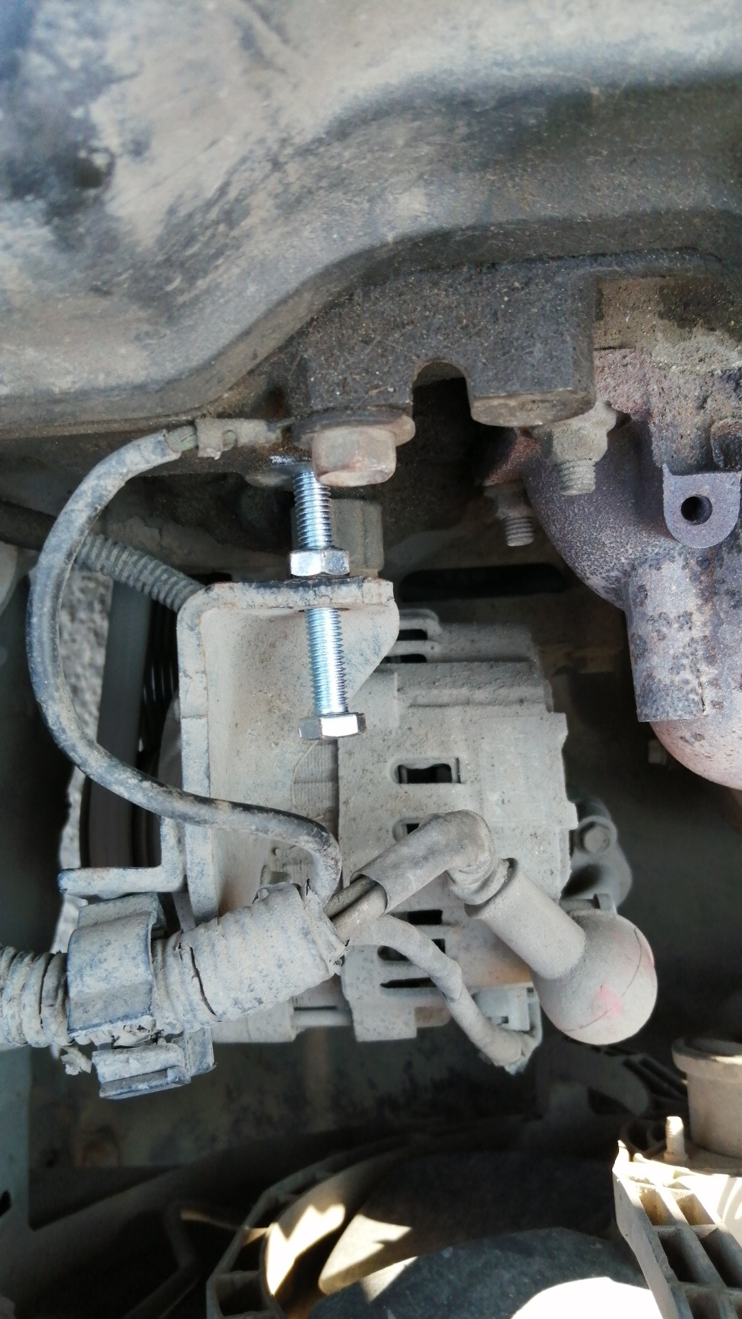 кстати натягивали первый ремень такой же системой как и второй, вместо болта который крепит кронштейн гены, сверху, взяли длинный болт М8 и гайку М8 болт в то же отверстие, гайку в болт накручивам так, что бы она была между головкой и кронштейном, болт до упора, и гайкой отодвигаем генератор тем самым натягивается ремень!;) см. фото