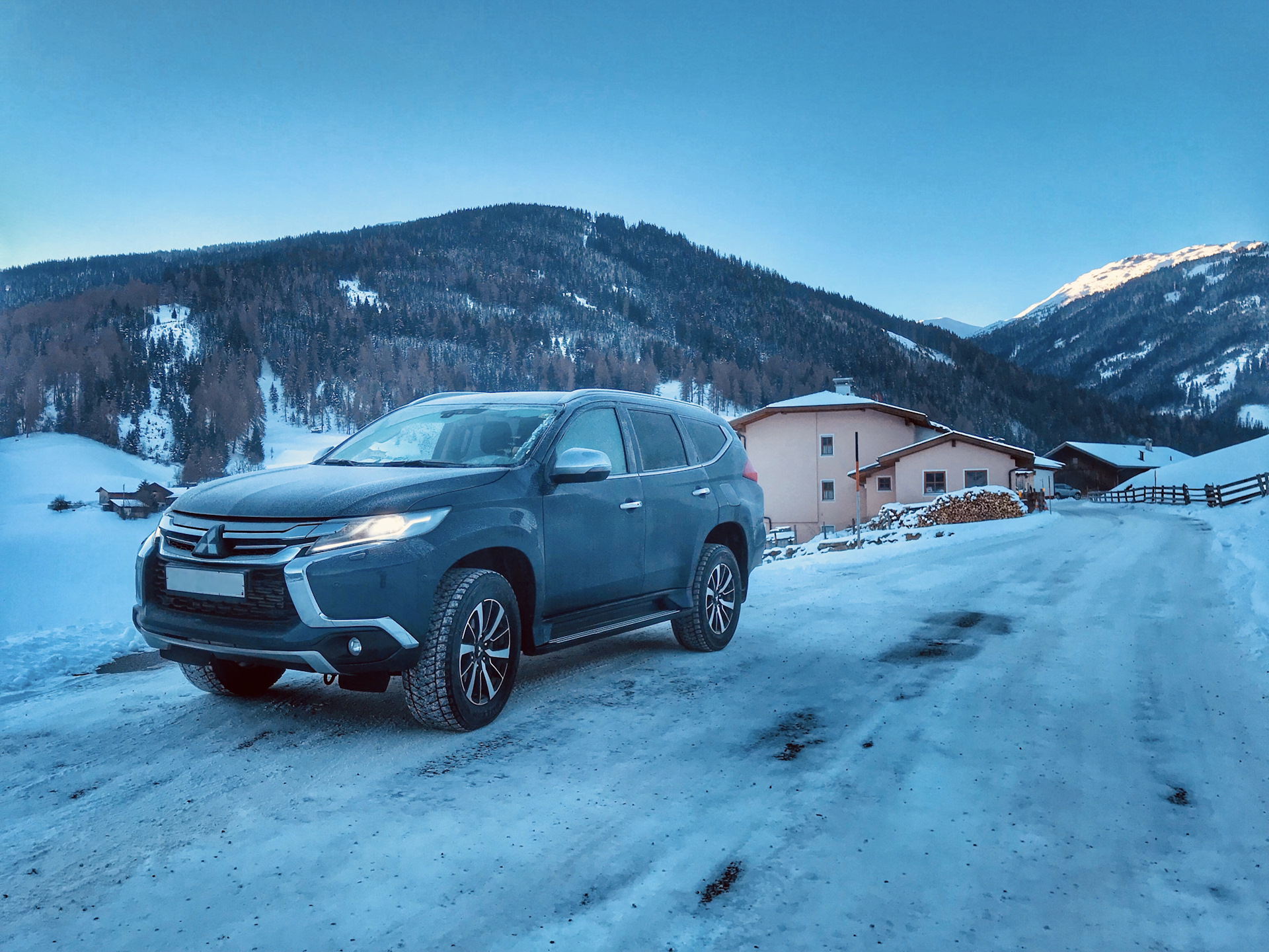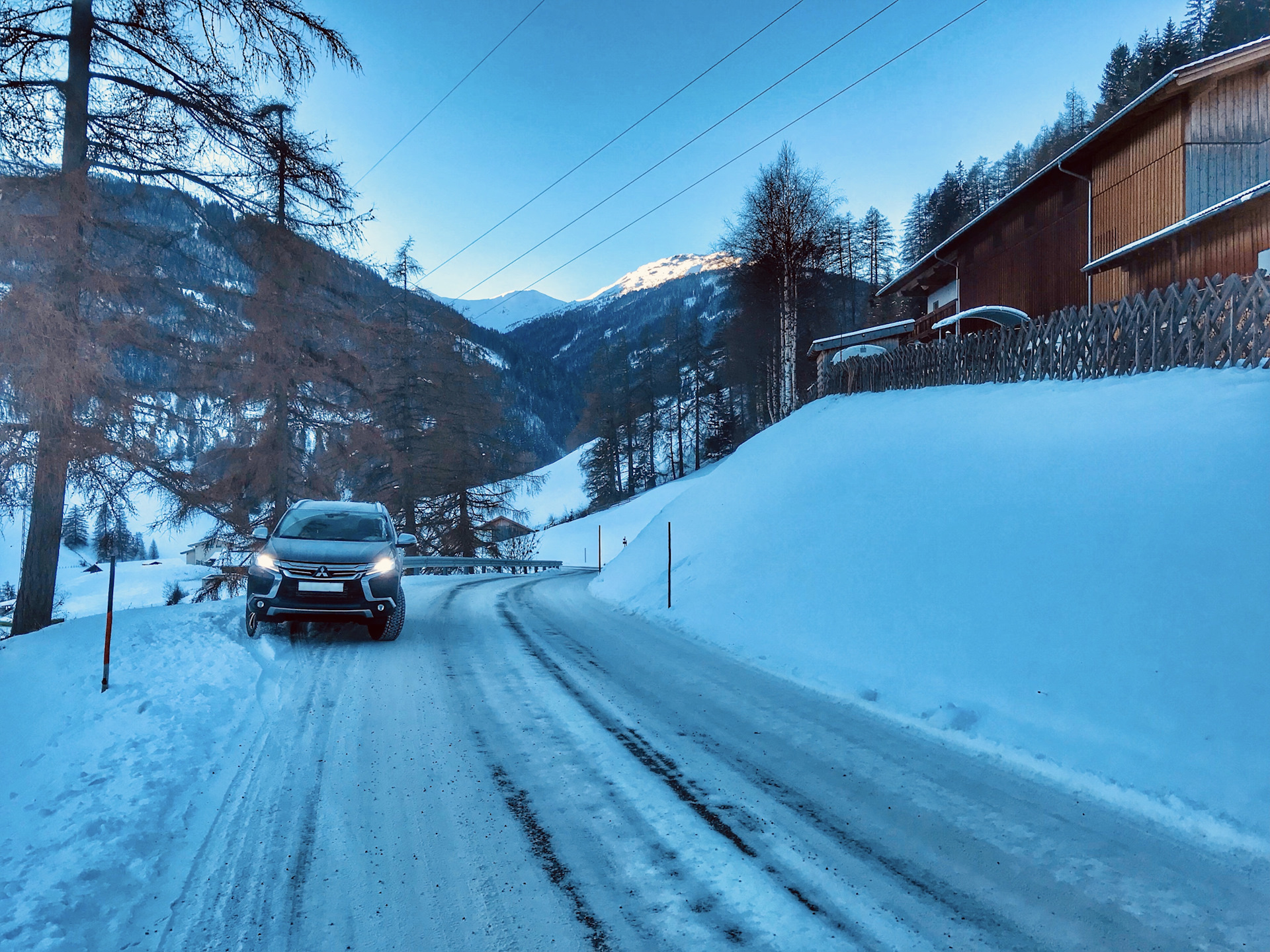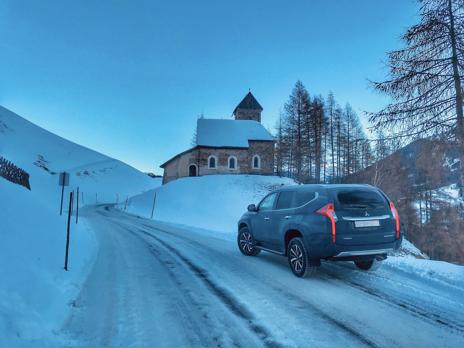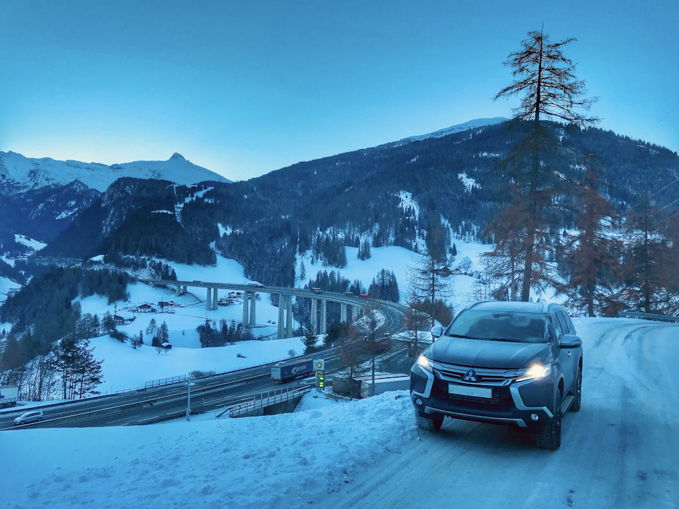 Если в прошлый раз нас ждали узкие улочки озера Комо, где мы пытались разъехаться с плотным трафиком и постоянно прибегали к 360-градусной камере, то сейчас на пути к гостинице Pajero Sport встретил более подходящую для него дорогу — заснеженный горный серпантин и вид на горы.
