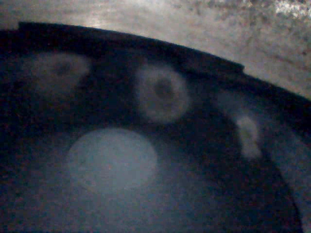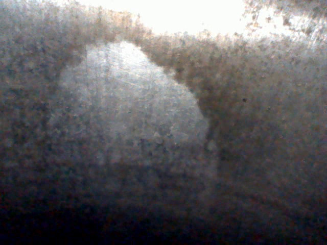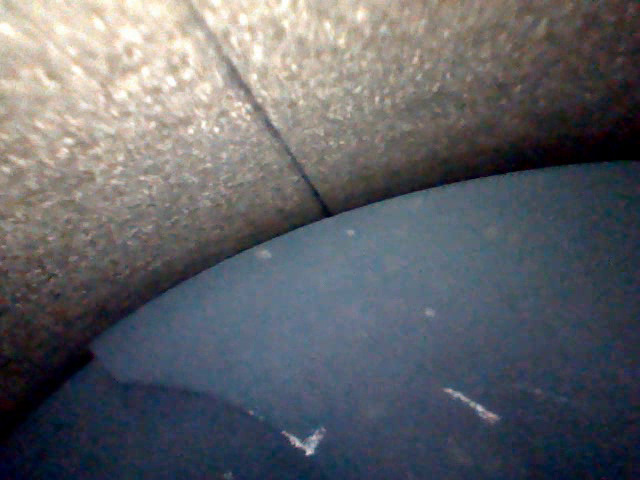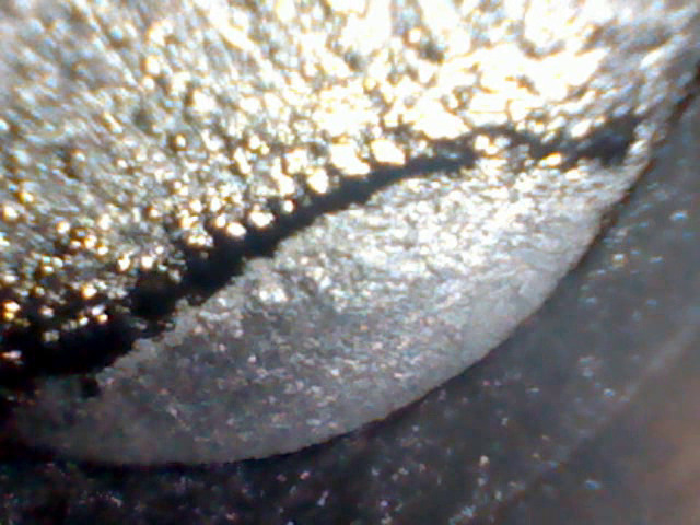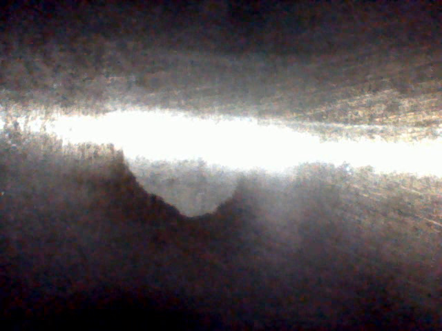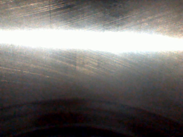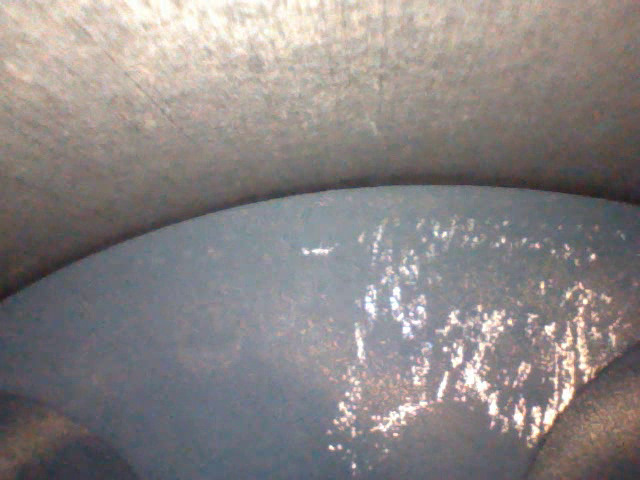 Четвертый цилиндр выглядит хуже: Хон почти не просматривается, пятно перекладки поршня — самое большое, непонятные темные полосы-разводы на стенках (масло?). Вблизи поверхность стенок цилиндров странная, напоминает эрозию/ржавчину. Больше данным прибором не увидеть. Но криминальных задиров, говорящих о разрушении поршня/колец, здесь тоже нет.