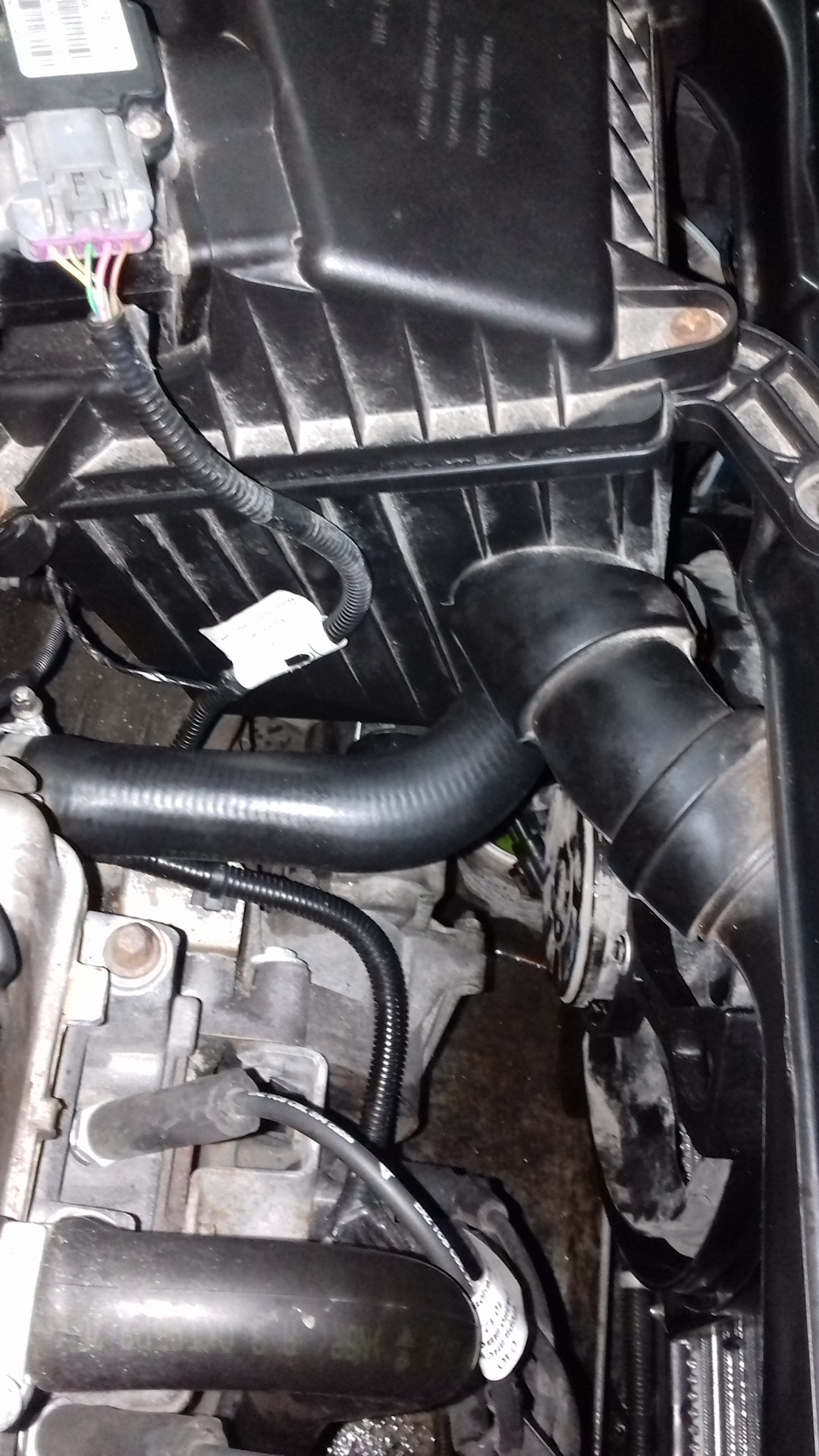 Из всех переделок это, патрубок верхний, идёт сразу под воздуханом, нижние резинки снял с Грантовского радиатора одел их на ножки Калиновского, и вырезал шайбы резиновые из сайлентблока примерно 0.5 см, одел их на нижние резинки, что бы радиатор поднялся и верхние крепления совпали, сами ножки уже вставляются в другие отверстия, они уже там есть))), вентилятор перекрутил на Калиновский диффузор, тоже подходит.И всё на месте, радиатор немного верх завален вперёд, но это не критично.Вот так верхний патрубок идёт.