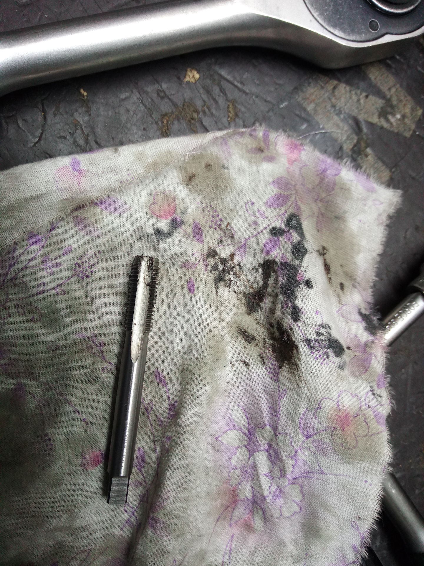 Промыть бензином отверстие под болт шкива ГРМ не удалось, метчиком достал грязь и стружку.