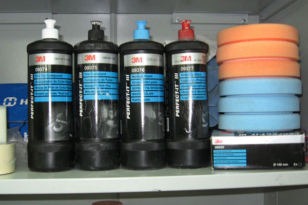 Полировальная система 3М, предназначенная для выполнения трехэтапной обработки поверхности, зарекомендовала себя хорошо. Каждый предыдущий слой пасты обязательно смывал. Полироль 3М с артикулом 09374 – у нее самый крупный абразив в своей линейке, и она максимально быстро располировывает замытые поверхности и мелкие царапины.