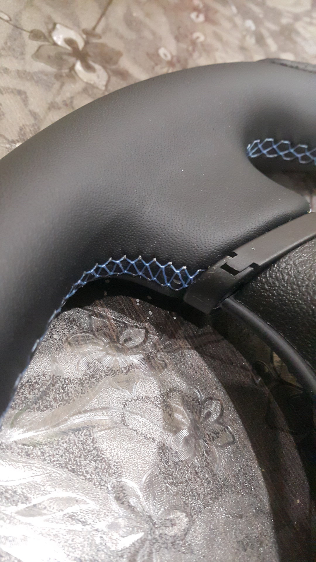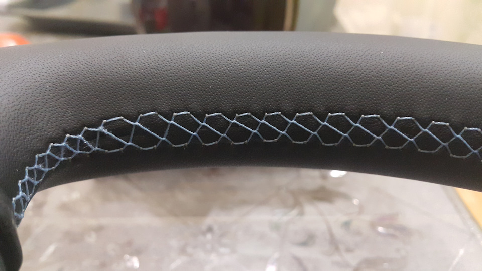 Отдал руль в перешив, кожа наппа, гладкая и верх перфорация, строчка голубая нитка.