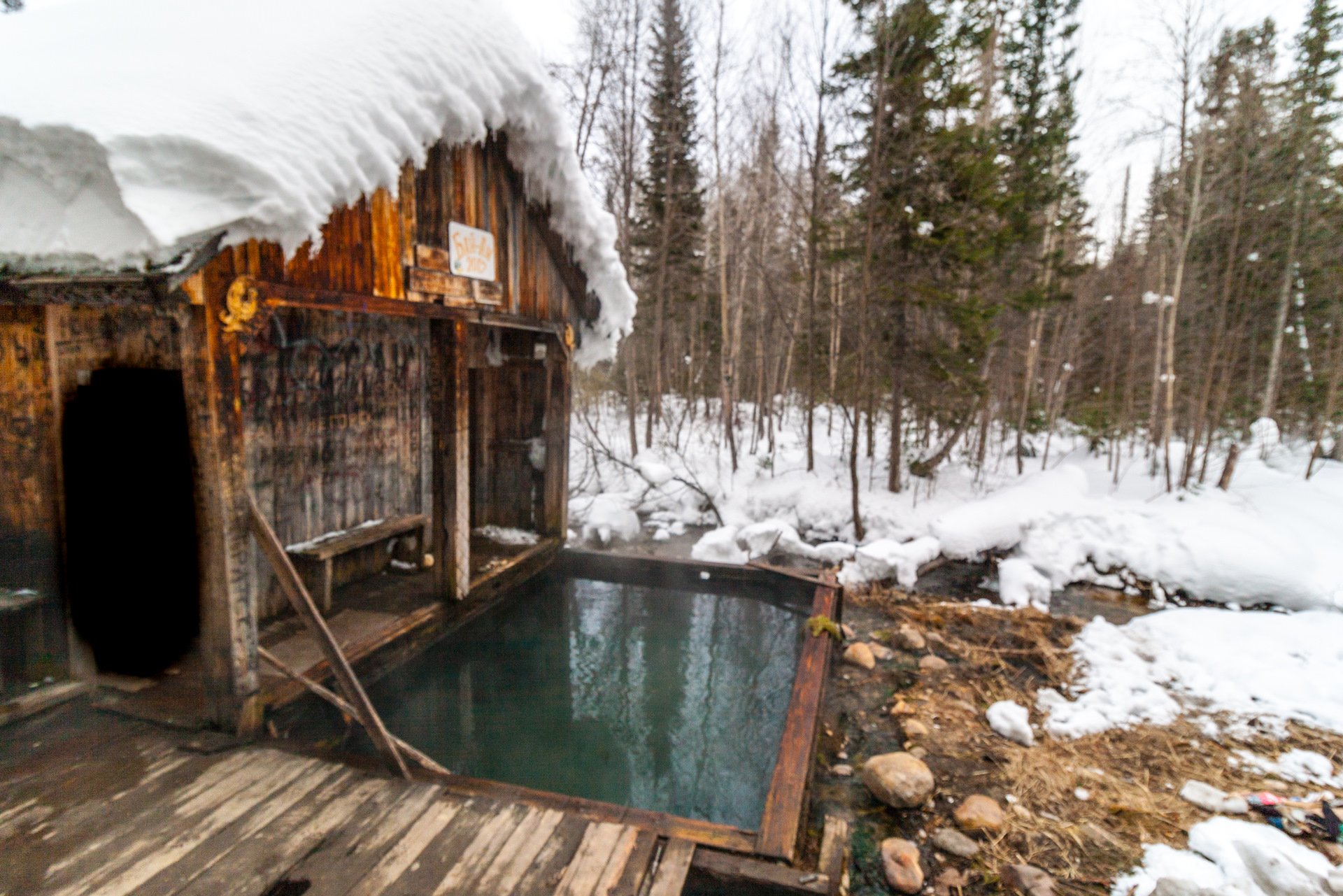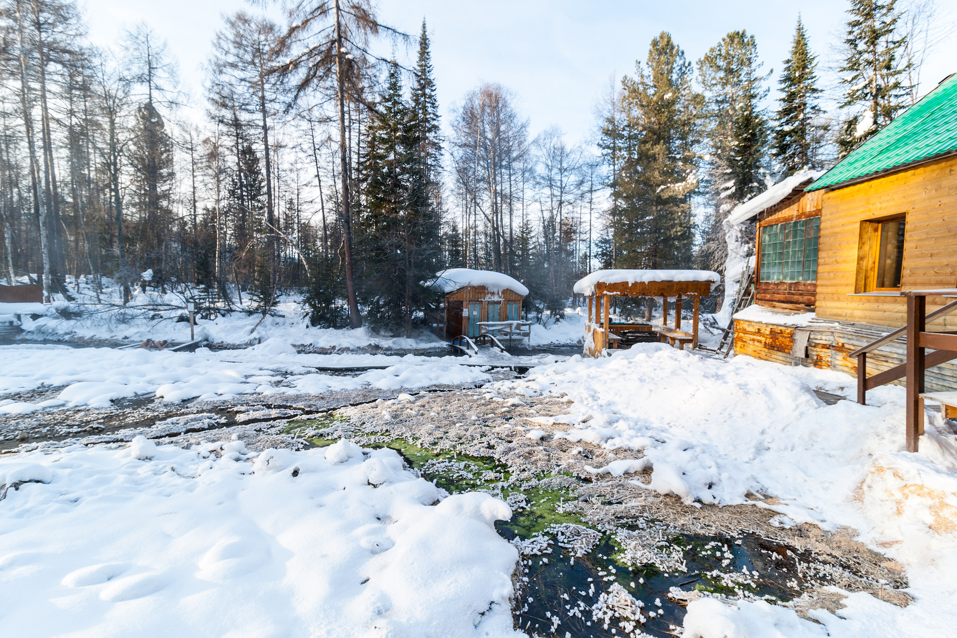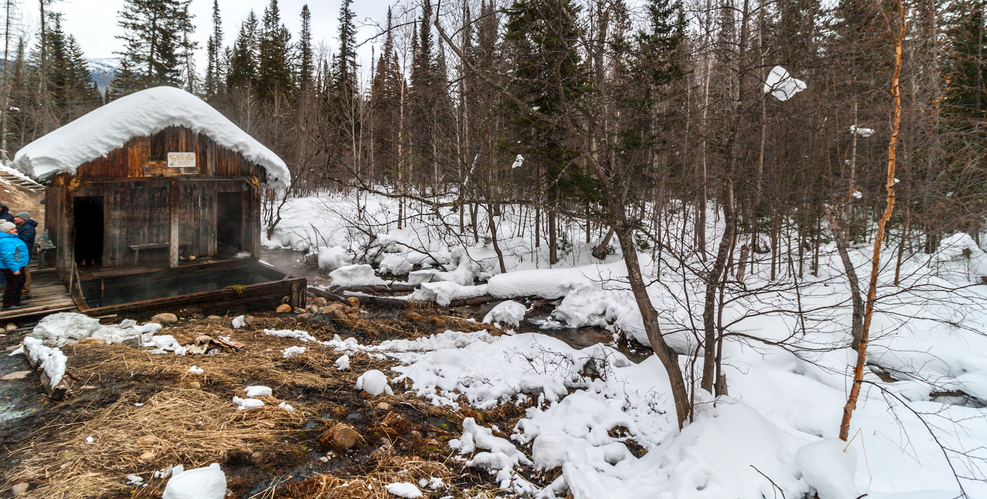 Есть два варианта купания. Первый – на «цивильной» Дзелинде – 350 рублей, тёплая раздевалка с душем и каменный бассейн, вроде бы выложенный мозаикой, но сейчас почему-то закрыт плёнкой. Тут же рядом домики для проживания, даже кафе есть. Панорама от раздевалки: