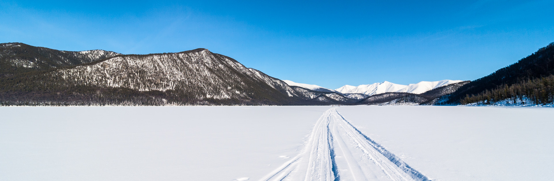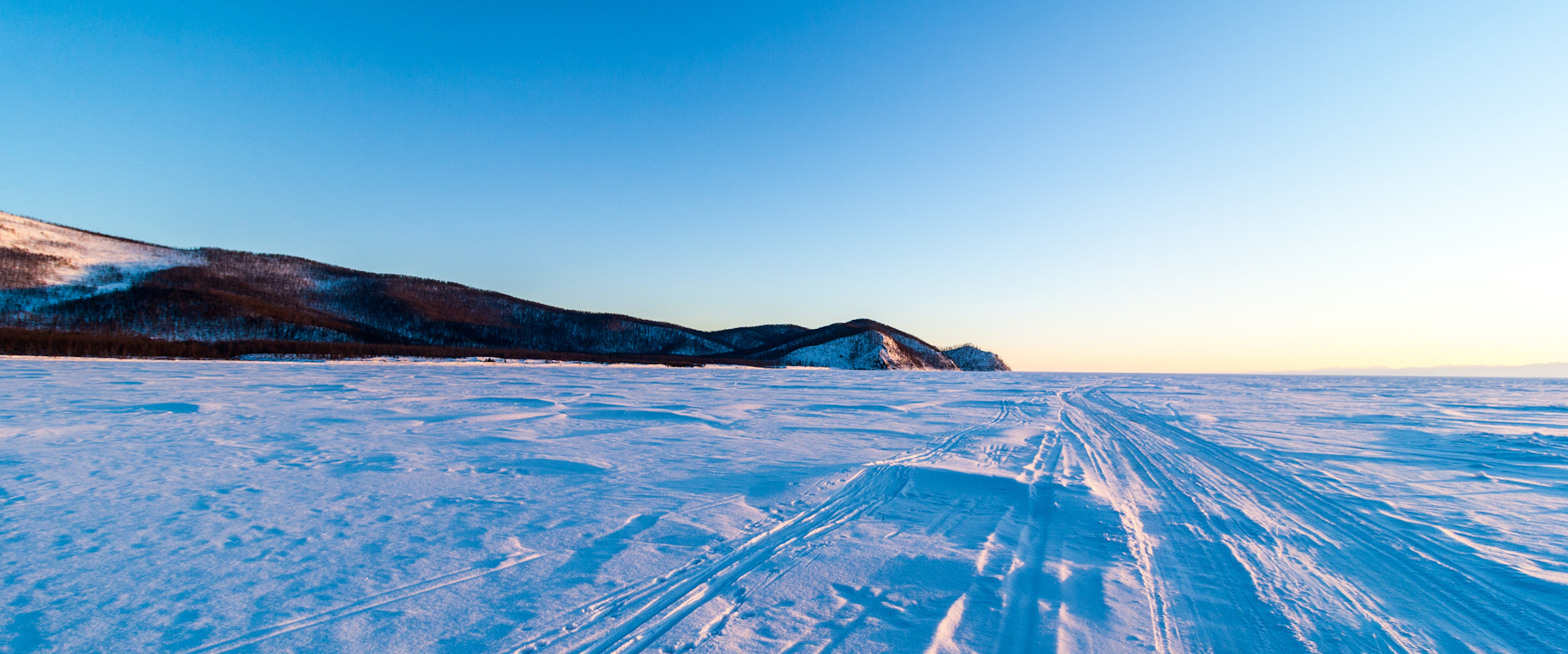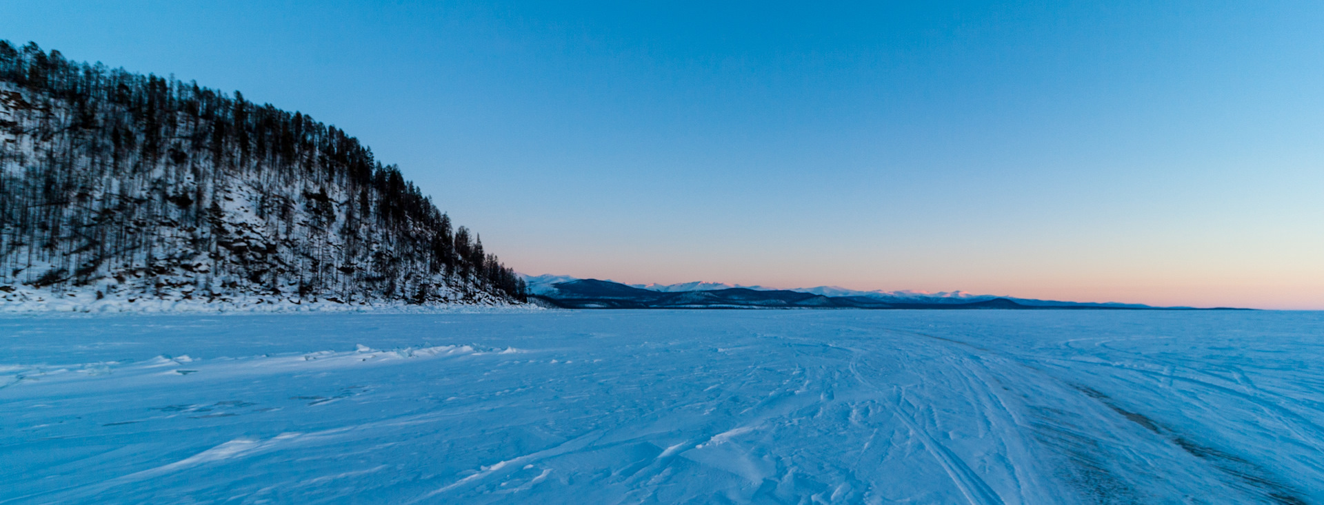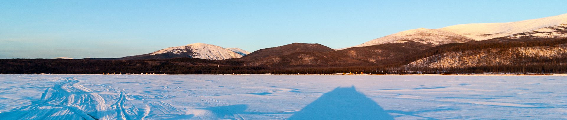 Выдвигаемся в сторону Хакус, до туда около 40 км по льду. Зимник помечен ёлочками, не всегда прямой и не такой хороший, как на Котельниковский, но всё равно позволяет двигаться быстро.