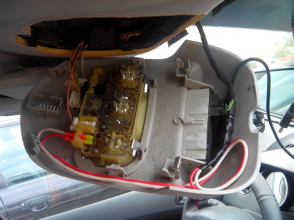 На разъёмах на козырьки есть при включённом зажигании + и — 12 вольт. Так что просто тестером посмотри где + и где — и подпаяйся к плафону. Только надо ещё сам блок спрятать где-то недалеко )