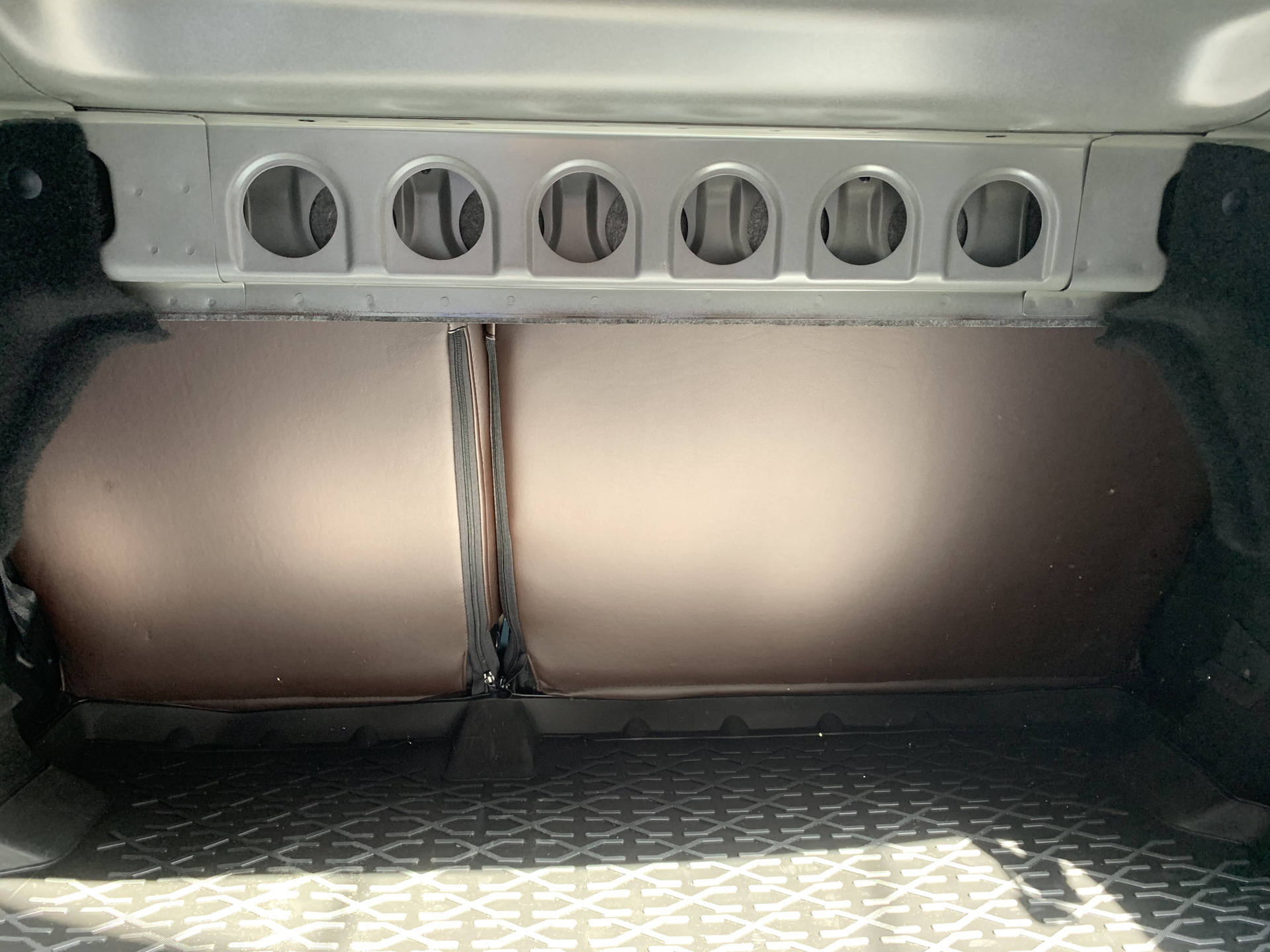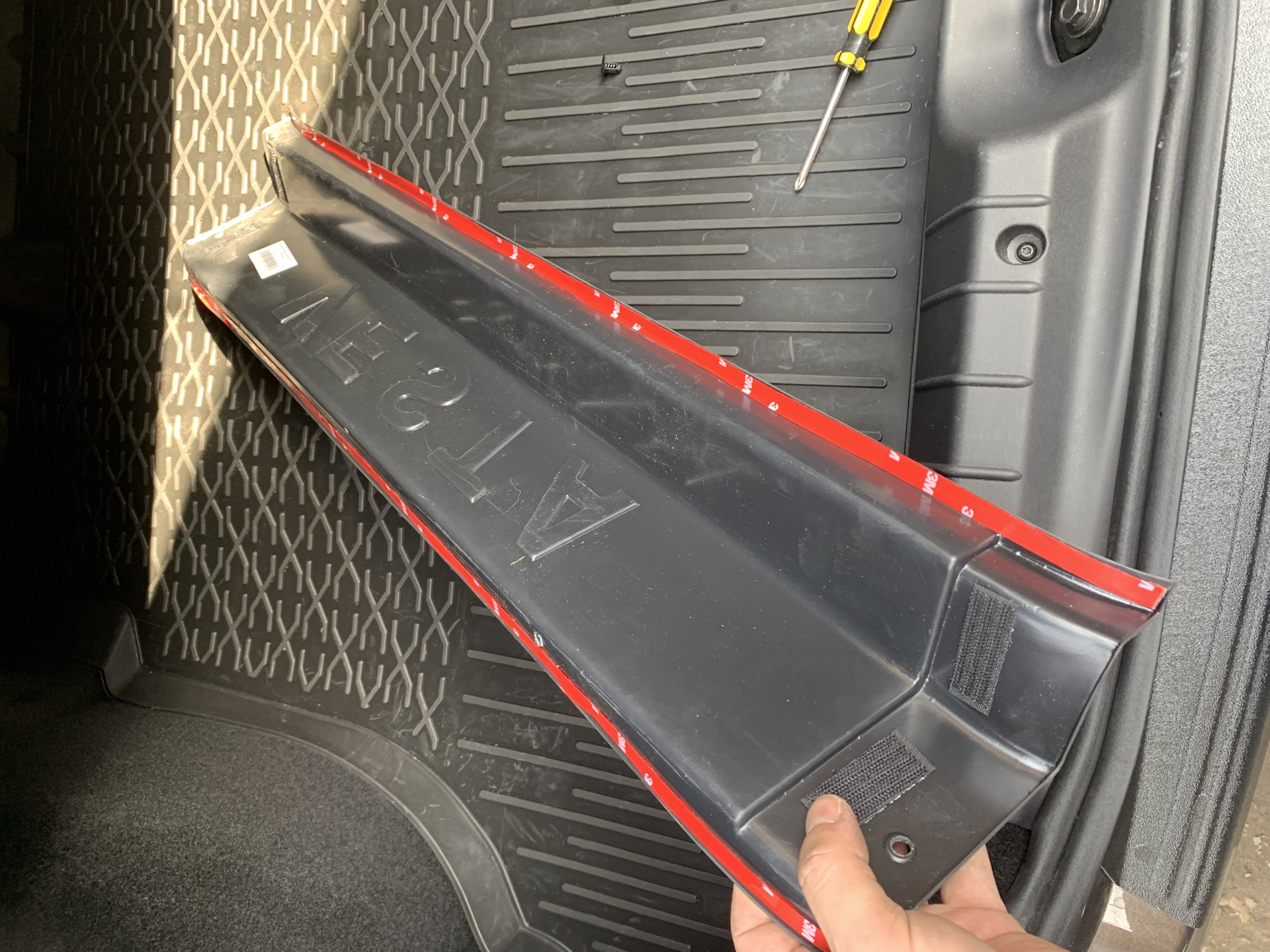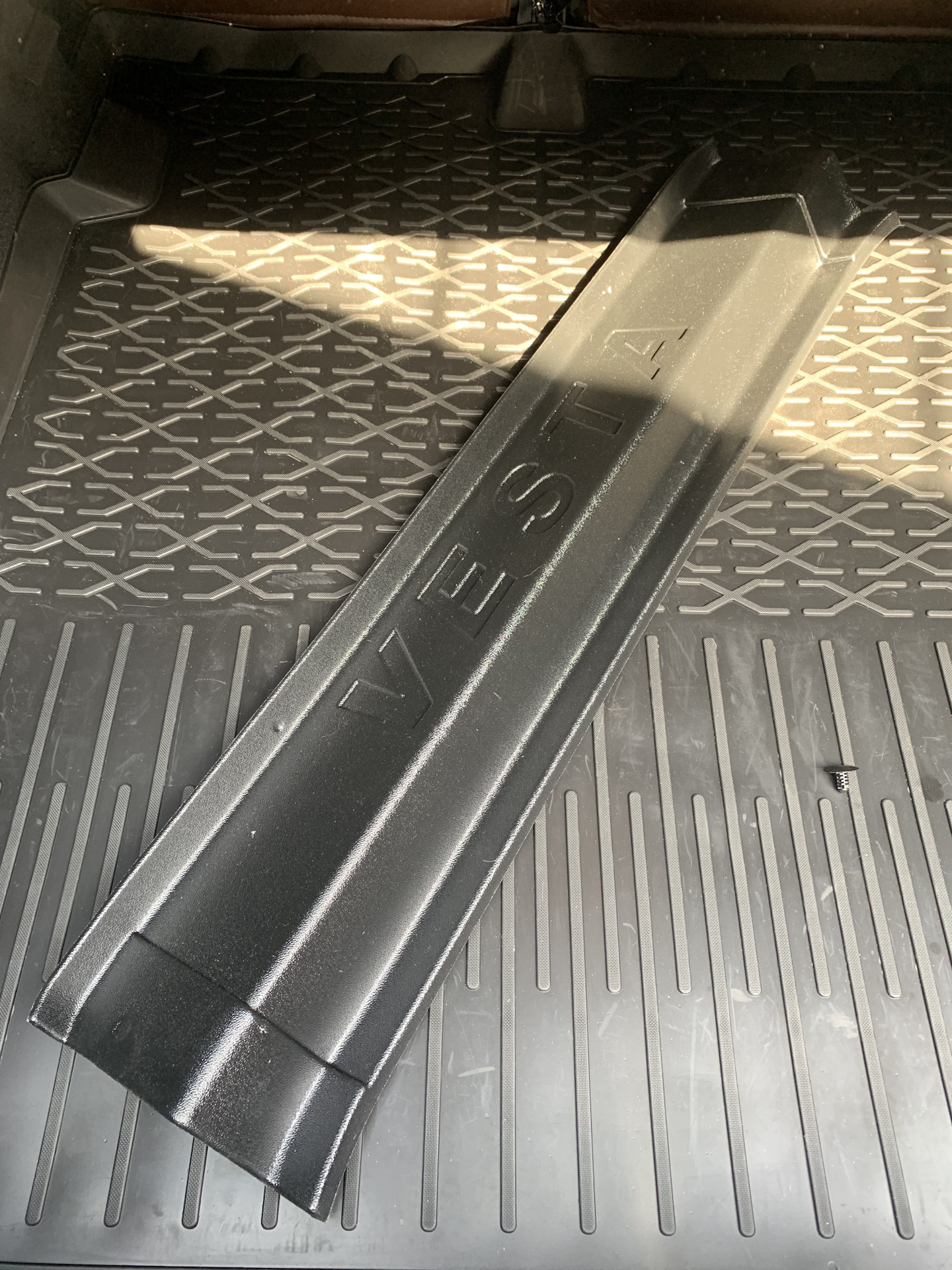 Приобрёл накладку в проем багажника. Надо было брать ворсовую. В накладке нужно сделать 4 отверстия под клипсы. Я дополнительно наклеил двусторонний скотч.