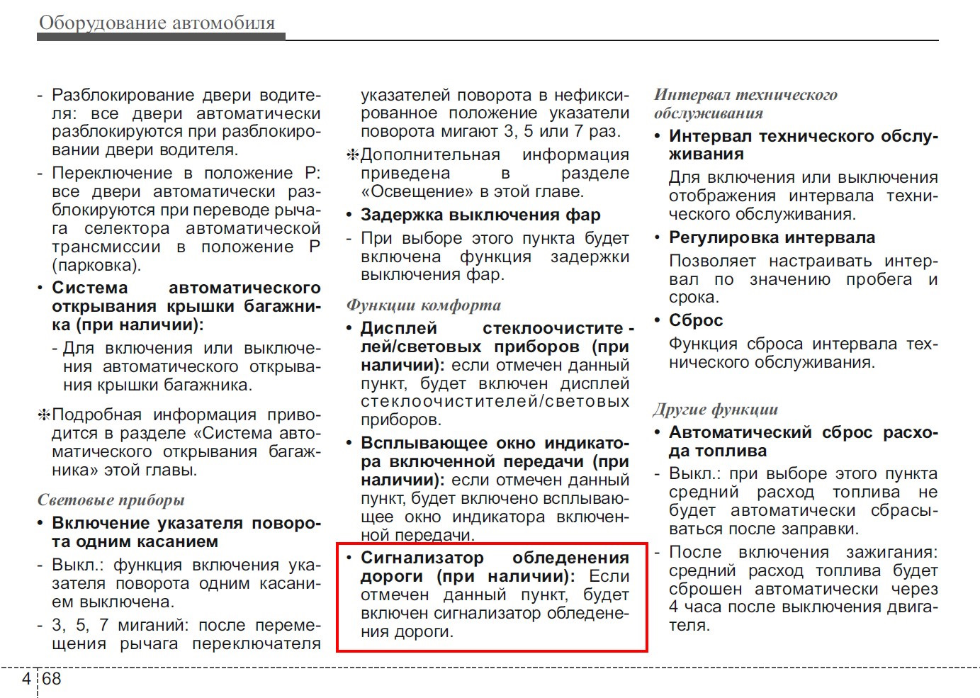 Непонятно, что надпись (при наличии) означает. 1)Так-то сизгализатор есть у всех, а значит при его наличии он должен отключаться… я бы отключил, раздражает. 2) Или (при наличии) означает наличие функции его отключения… у меня в солярисе в максималке нет такого пункта. А вот мануал к машине поискать надо, не помню где он.