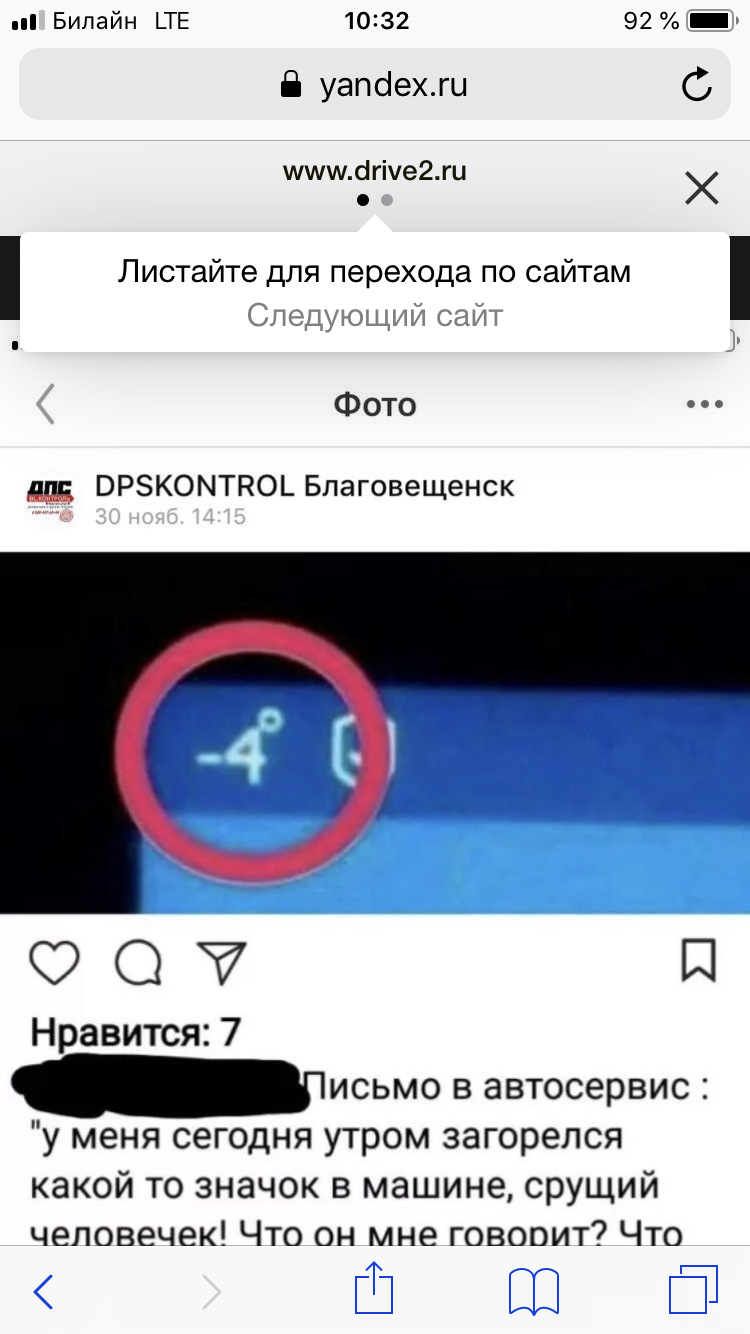 предупреждение о том что температура за бортом опустилась до +4 градусов. Появляется снежинка рядом. в Книге написало мол предупреждение о возможном образовании наледи на дороге