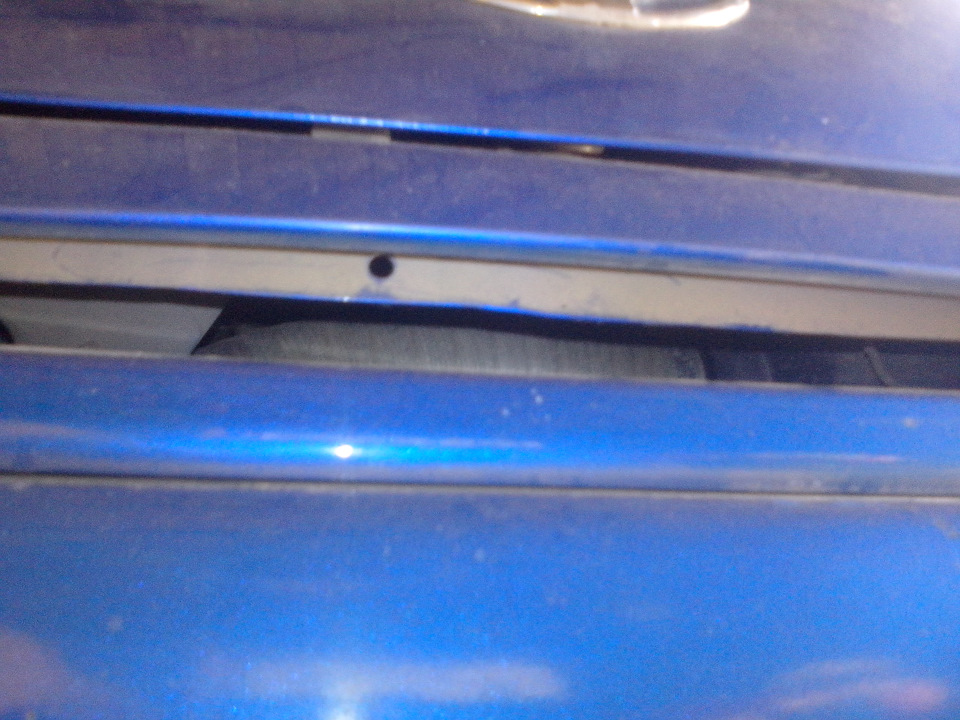 У меня после произошедшего когда-то удара передом, немного не совпадают отверстия накладки с отверстиями в кузове, поэтому вся пластиковая штука держится на 4-х крайних штифтах. В прошлом году соскочила пружинка с крепления и не открывался капот. Фигня вопрос — снял улыбку, отогнул крючок, открыл капот. ))