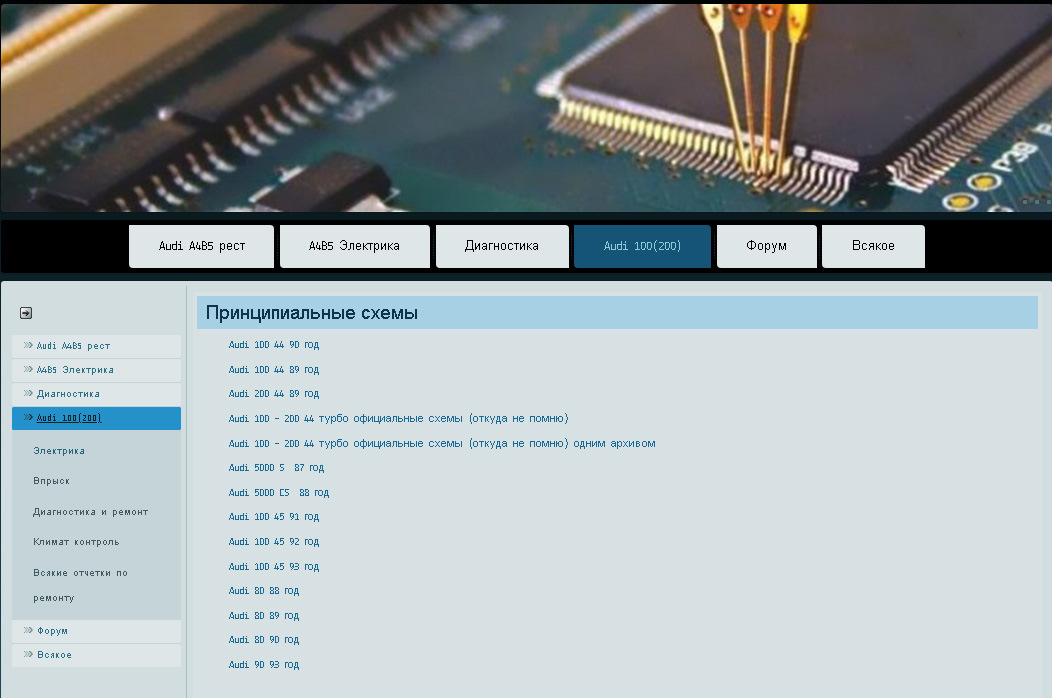 Совсем старые схемы я не буду отдельно разбирать и выкладывать еще раз. Вот тут они у меня на сайтике, все разложены по годам и машинам. А именно – Audi 100/200, 80/90, 5000S/5000CS, S4 года 85-93. www.sizov.org/audi/shem1.html