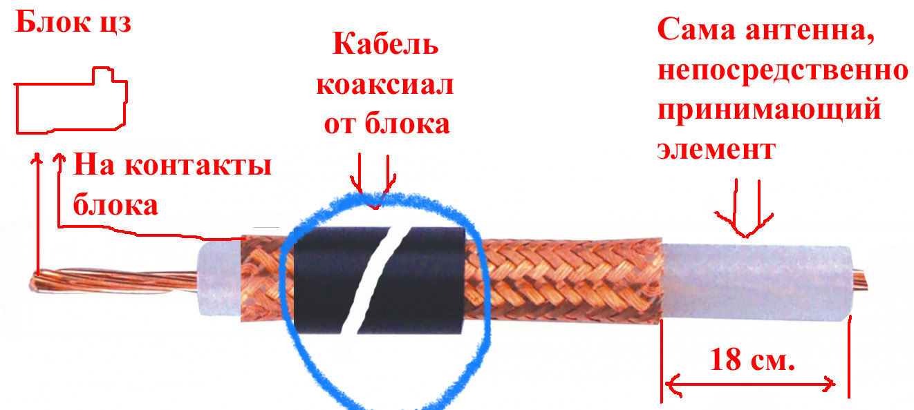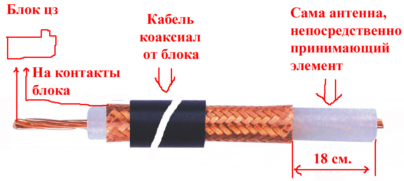 Берешь тонкий экранированный провод, тянешь его от разъема блока ЦЗ, центральная жила на сигнал а оплетка на землю. Антенну подключаешь к центральной жиле, вот и все. С волновым сопротивлением кабеля можешь не заморачиватся…