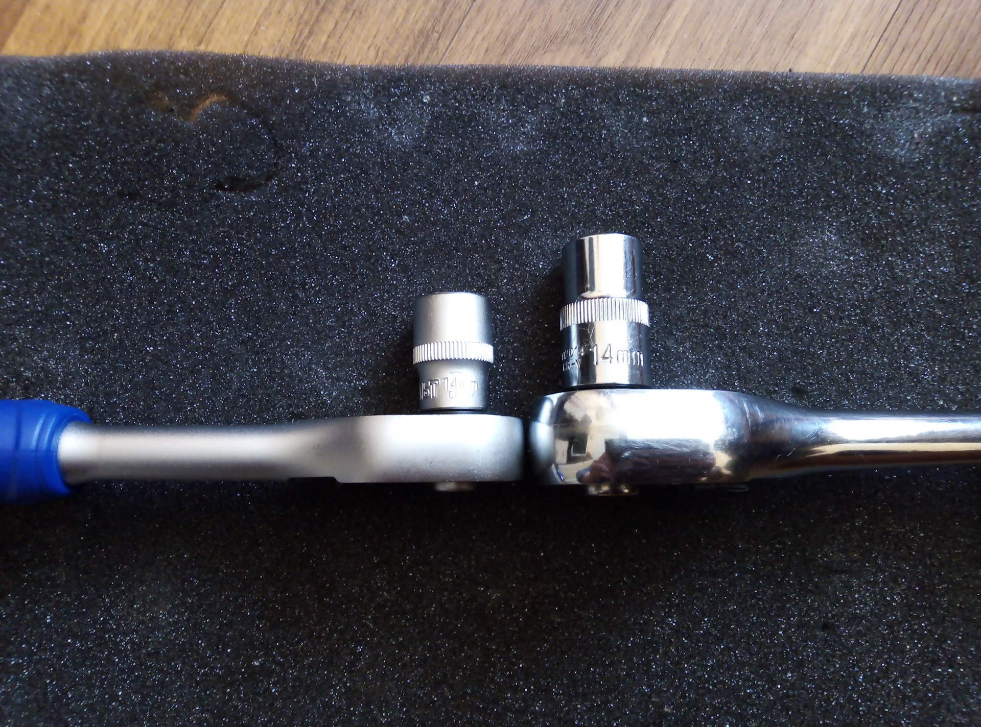 В начале решил открутить маленькой. Не прокатило. Затянуто сильно. Трещоткой на 1/2 с удлинителем два болта открутились в легкую. А вот с третьим заминка. Открутить можно, но только с карданом. А нафига нам кардан. Берем среднюю трещотку и без напряга выкручиваем. Закручивал все также средней.