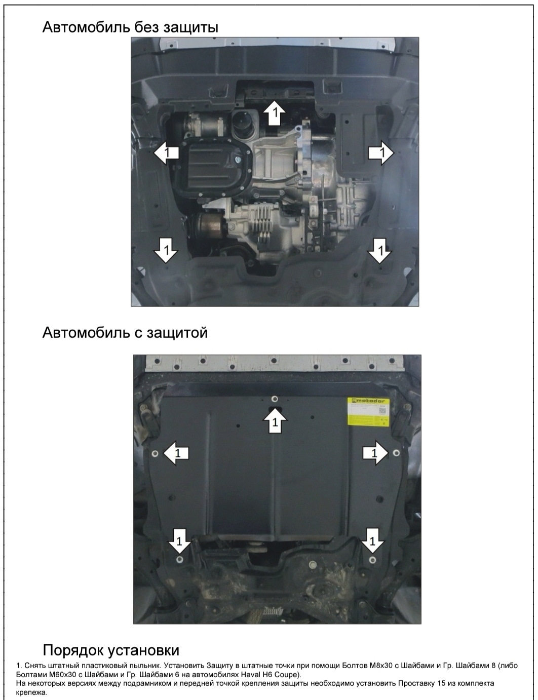 Сегодня выбрал время и съездил на яму, чтобы установить защиту двигателя. Вооружившись инструкцией производителя и прочитав её полез устанавливать. Производитель предлагает нам снять пыльник и в штатные места крепления установить защиту.