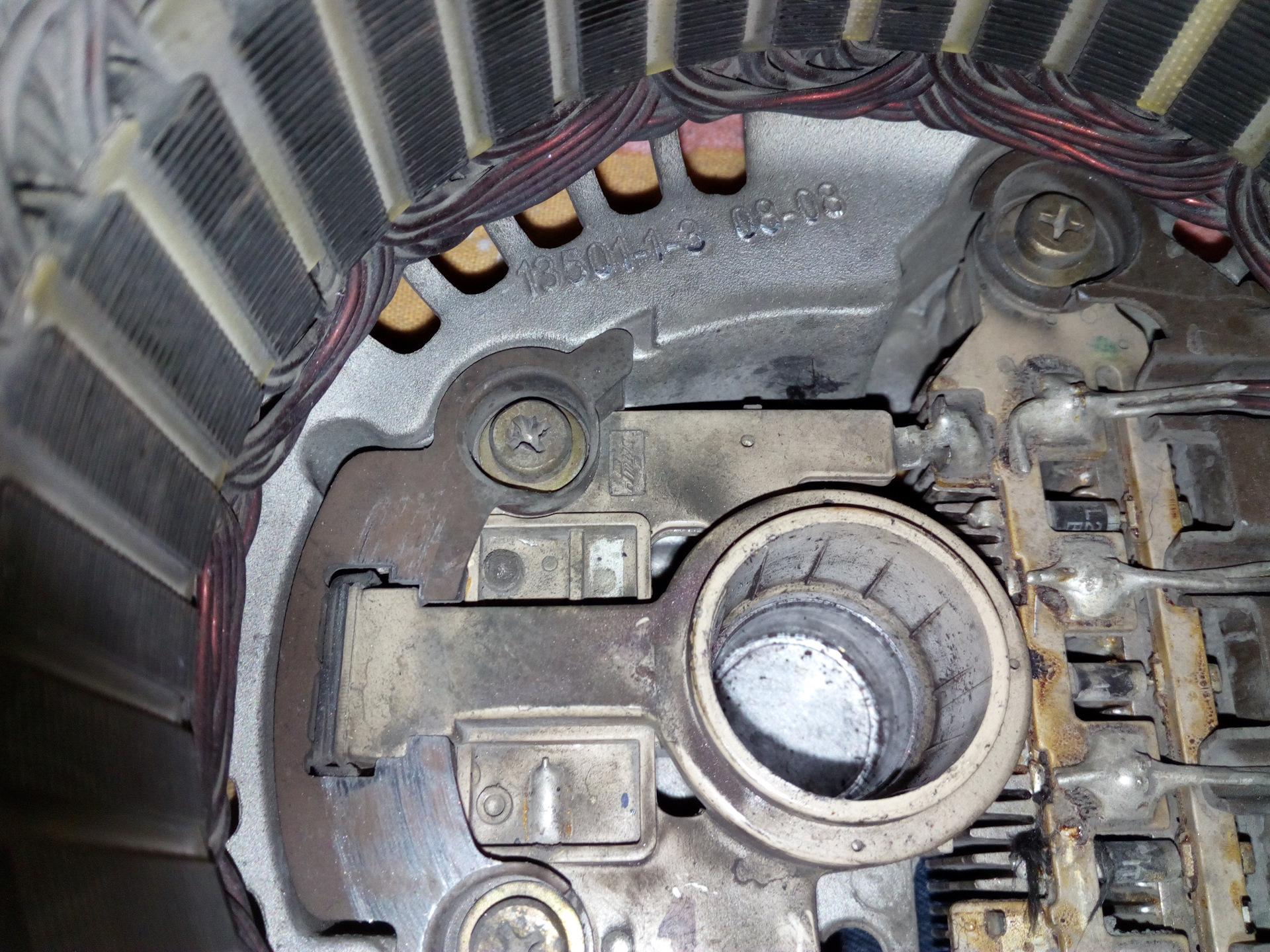 ВАЖНО! Надо снимать крышку, которая расположна ближе к шкиву! Если попытаться снять другую крышку (ту, что со стороны щеточного узла), то можно повредить проводку в генераторе!
