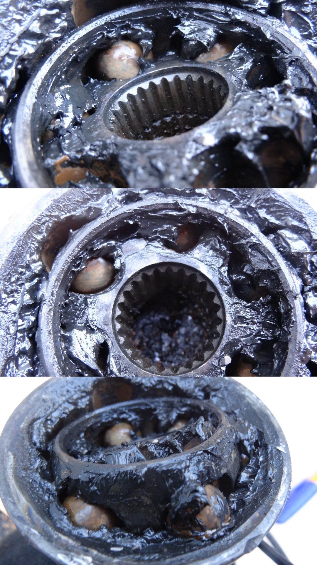 История с вращением вала точь-в-точь как в посте «№43 — Замена пыльника наружного ШРУС без снятия привода», когда я просто не посадил достаточно гранату на вал и не прошел стопорное кольцо. Но в этом случае я был уверен в том, что дважды я так накосячить не мог, это 100%. Повторяю все работы заново, снимаю пыльник и вижу в нем один из шести подшипников, писец. И вид стопорного кольца был какой-то кривой, загнут на одном из концов очень прилично.