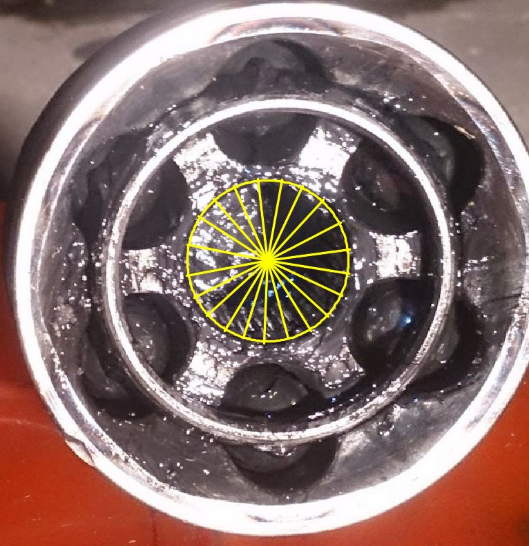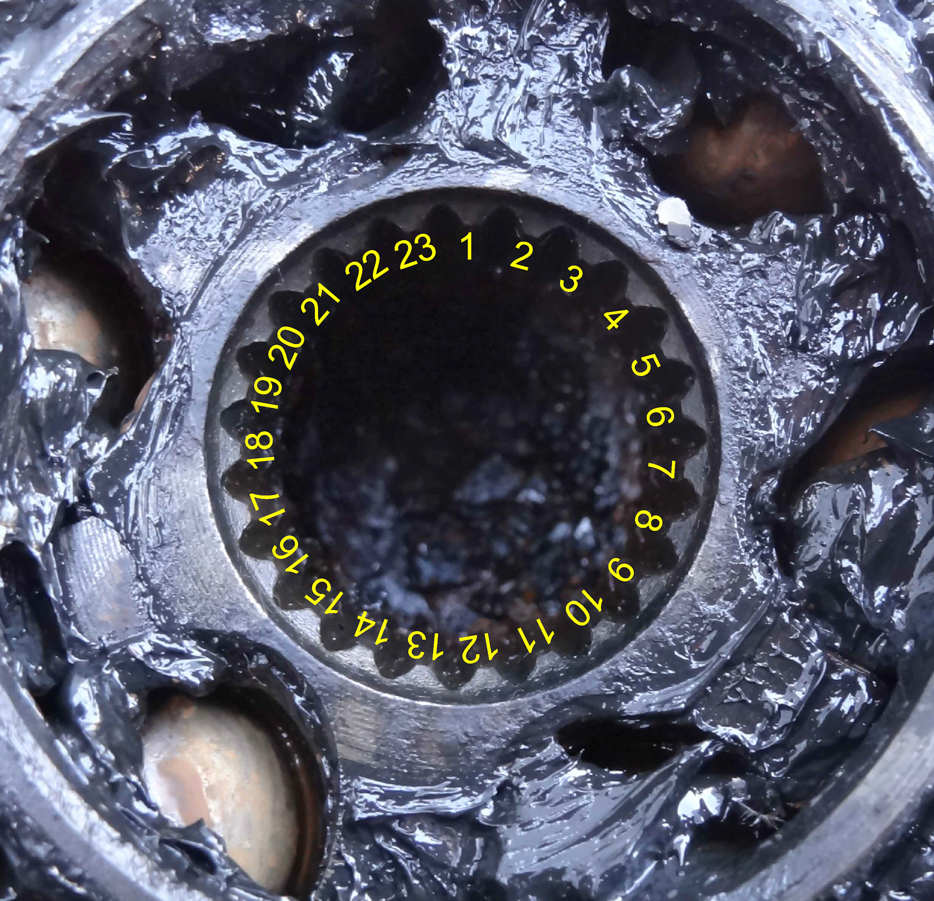 Получается, что у меня стоит какой-то непонятный дубль вала и гранаты, ибо в оригинале идет 23 шлица на внутренней части ШРУС. Усложнял подсчет еще тот факт, что в то время я не снял со шлицов смазку, и сейчас бы скорее всего горя не знал и точно был бы уверен в точном их количестве. А вместо этого снова приходится греть мозг, как выкрутиться из ситуации =) На фото ниже попытка подсчета точного количества шлицов по ужасной неинформативной фотографии.