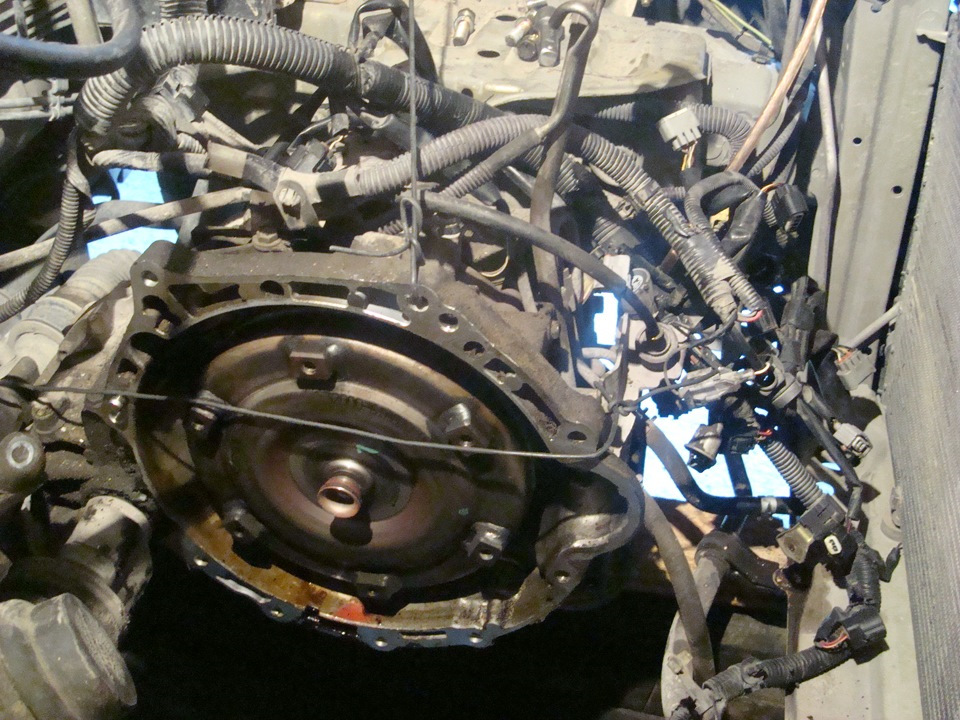 Находим что подложить под коробку. (Не под поддон) Через люк колокола откручиваем гидротрансформатор. Откручиваем колокол по периметру. Начинаем понемногу раздвигать агрегаты. Из моей практики вынуть двигатель не получилось пока я не открутил правую подушку коробки. У меня появились дополнительно см и я вынул двигатель.