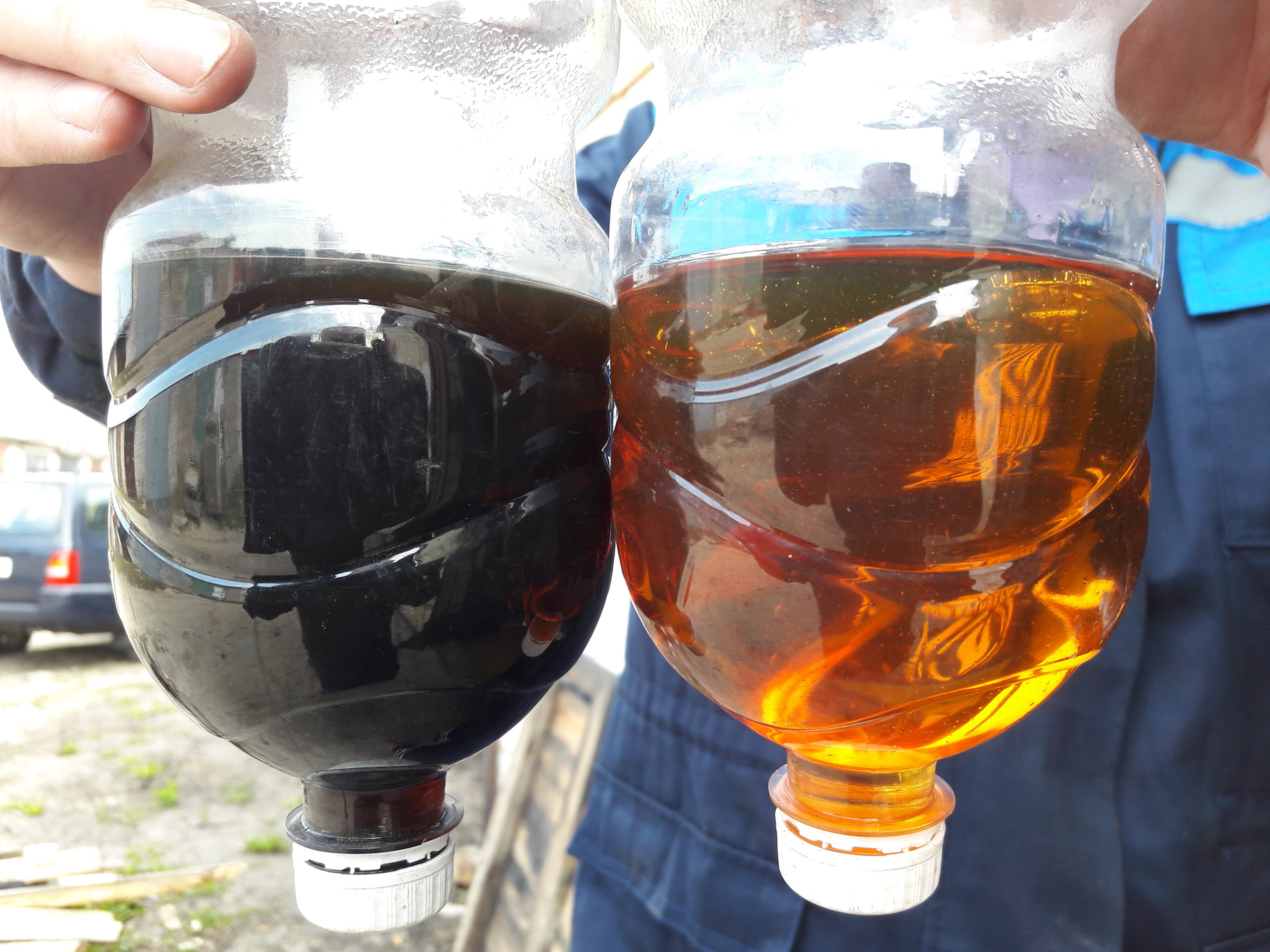 Следом шприцем вытягиваем жижу. Получилось вытянуть где-то 480 мл. Откачанная жижа тёмно болотного цвета и совершенно непрозрачная, новая — золотистая и прозрачная: