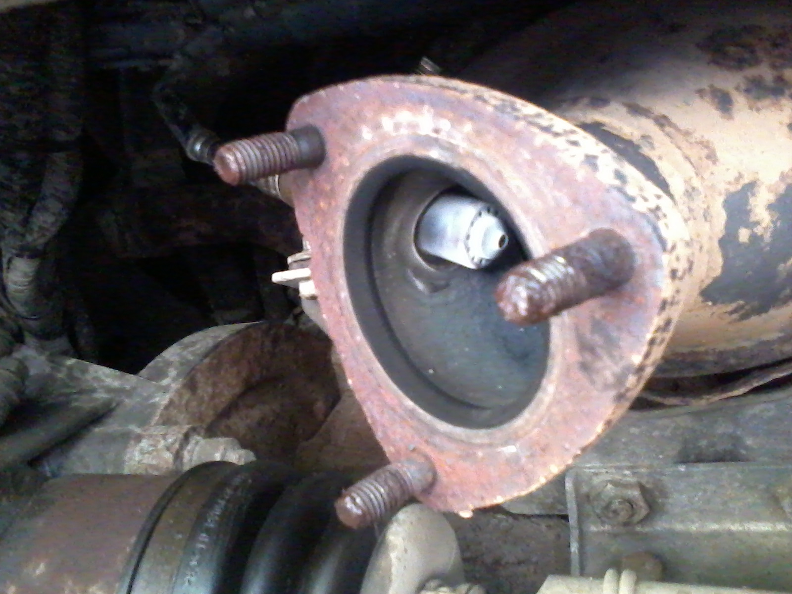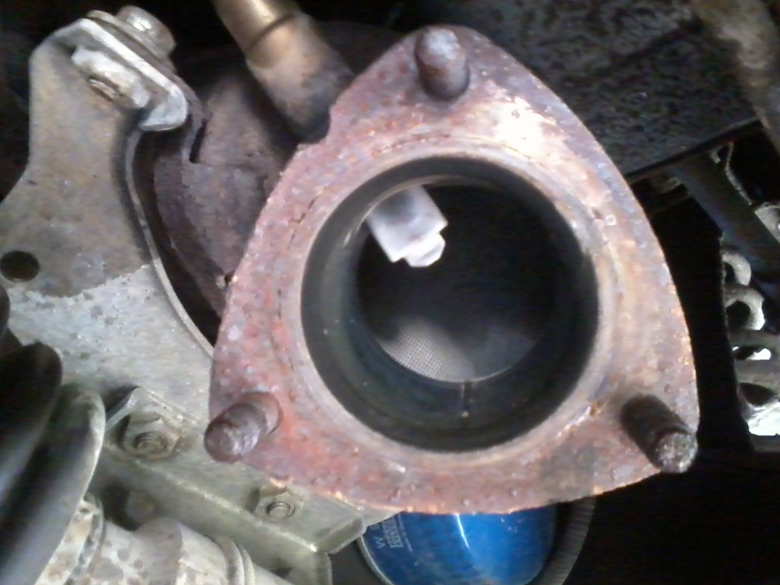 На фланец поставил новую прокладку, резьбы шпилек обмазал медной смазкой и накрутил новые штатные омеднённые гайки. Были куплены латунные гайки приёмной трубы 2101, но не стал их ставить. Где-то читал, что сейчас это некая "порошковая латунь", не та, что была раньше, и закисает ещё хлеще омеднённых.