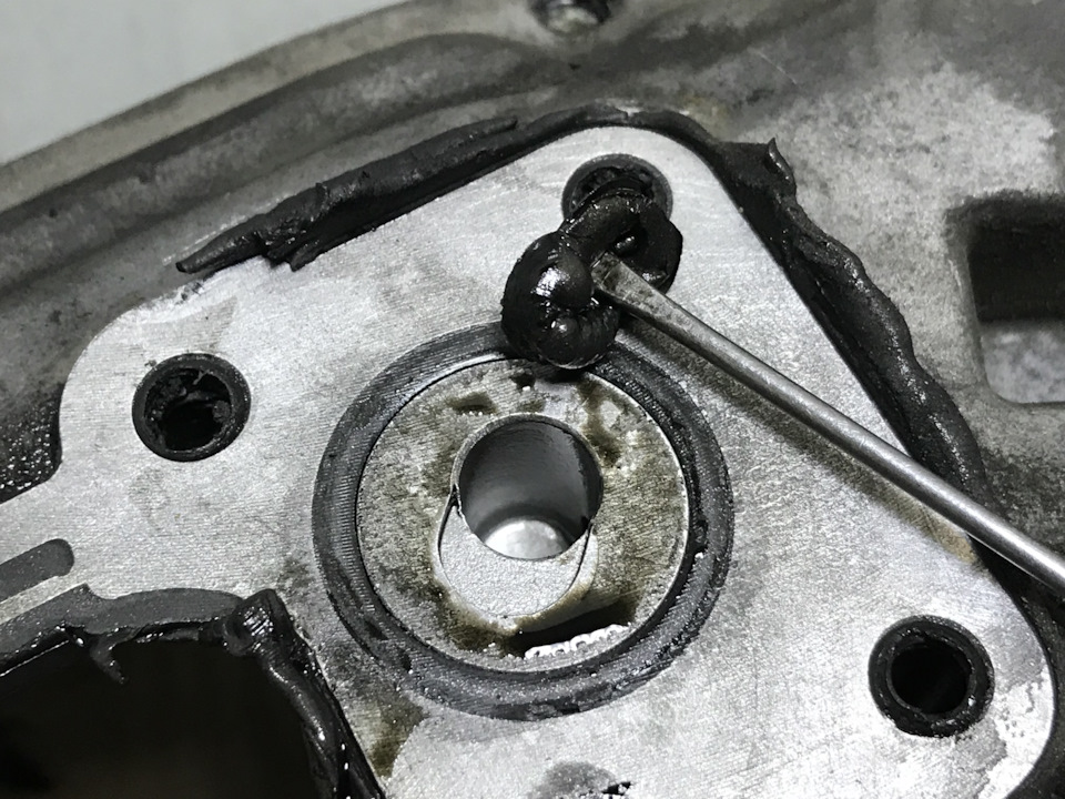 Кстати, по поводу колец уплотнительных. Видел у Вас тоже с ними беда была. На вскрытом мной стучащем по причине разрушения направляющего башмака цепи распредвалов моторе, менялась прокладка ГБЦ до этого. И рукожопы, за неимением уплотнения и видимо не желания его заказывать и ждать, тупо намазали герметиком. В итоге он попал в масляный канал натяжителя этой самой цепи, как следствие: потеря в нём давления, недонатяг цепи и разрушение башмака, а так же забитый осколками маслоприёмник. Фото прилагаю: