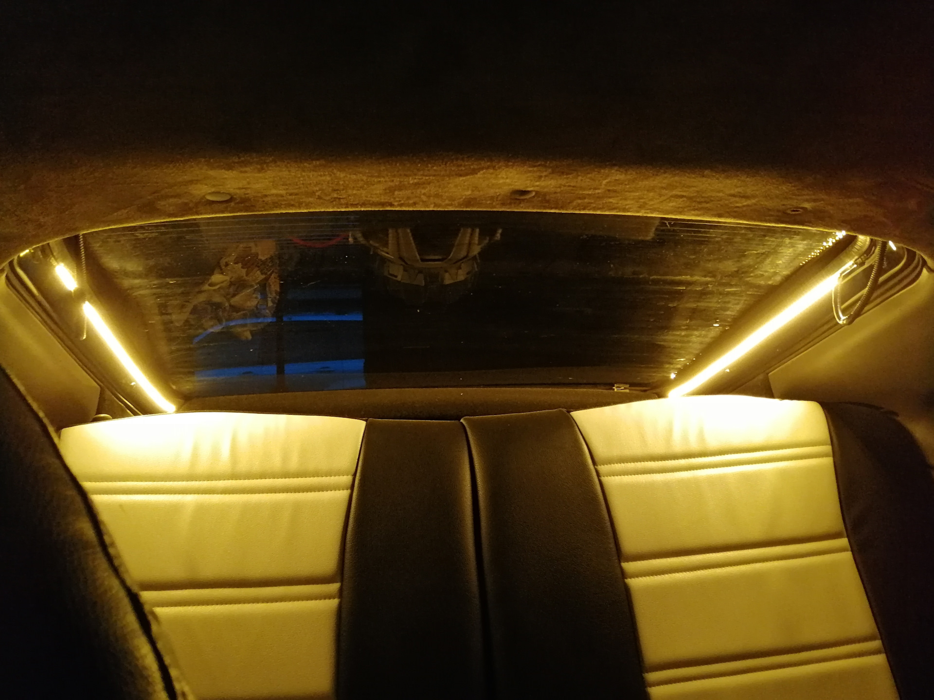 Вот так выглядит из салона, освещает отлично! Провода прокинуты по потолку, на ленту заведены через гофру, без неё багажник не открылся бы.