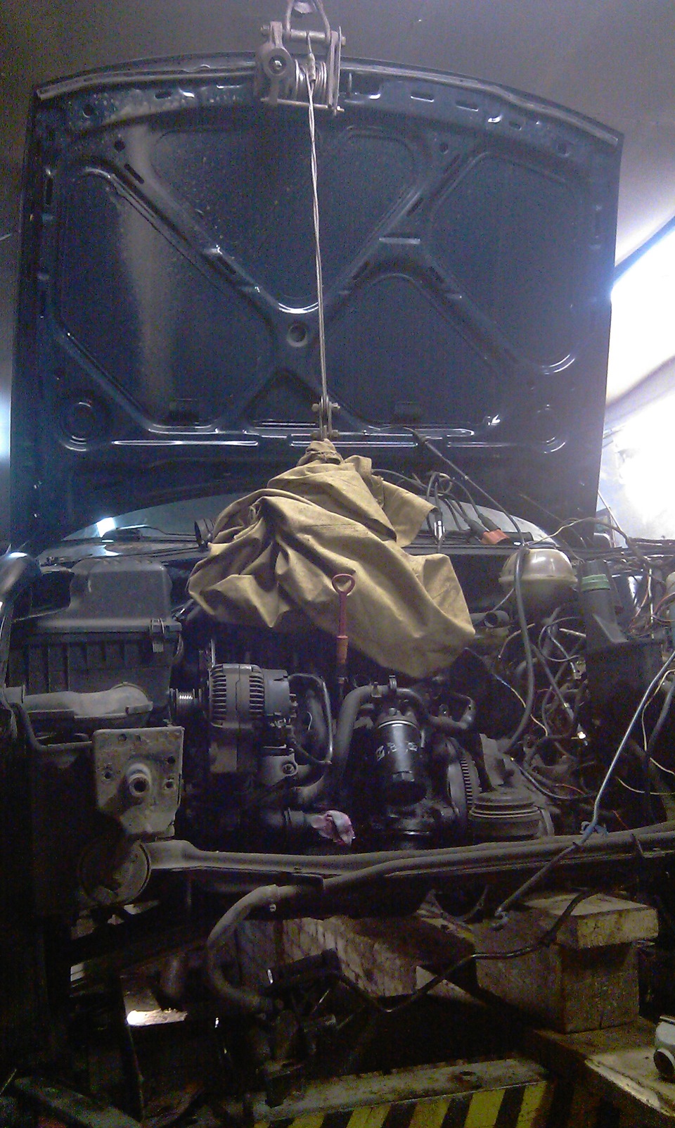 Снял морду с венты, мотор подвесили и машину просто откатили назад, предварительно уронив коробку на пол, чтобы не мешала.
