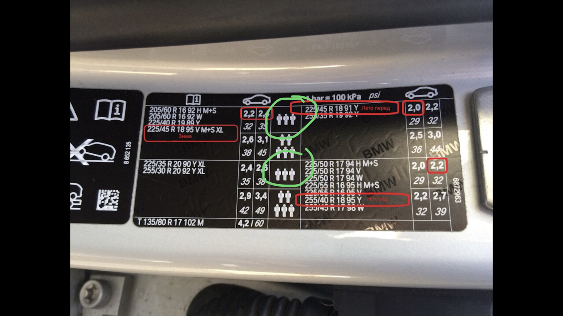 Вы неверно читаете табличку: 255/35 R19 в табличке есть, под 3 человек там указано 2.0 спереди и 2.2 сзади, под 5 человек 2.5 спереди, и 3.0 сзади)