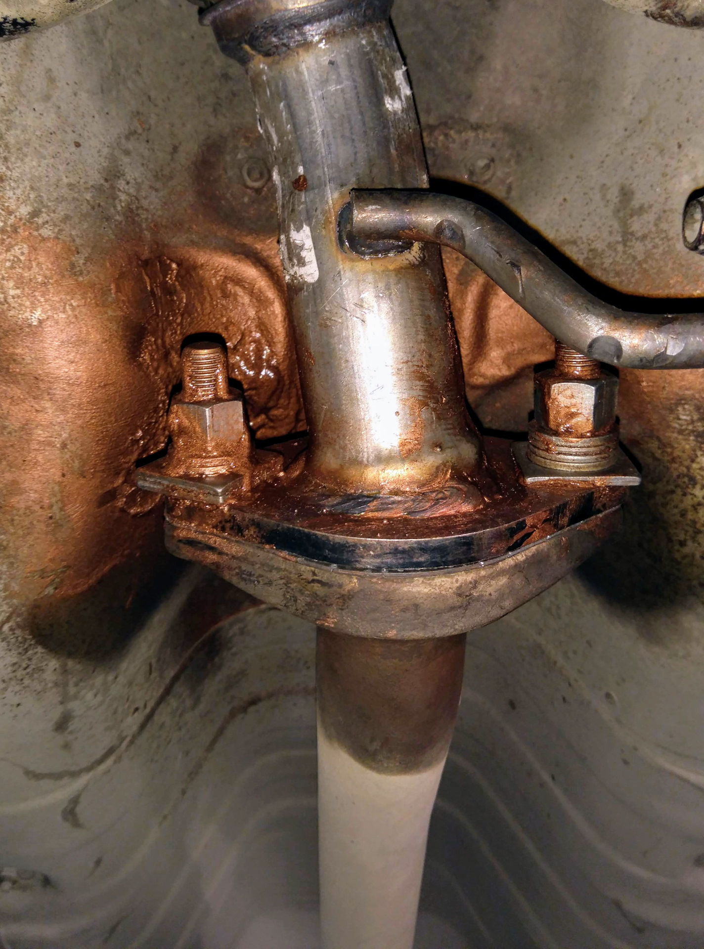Хорошенько зачистил резьбы щеткой, запшикал RW40 и очень вдохновился легко открутившимися первыми тремя гайками )))) Но самая неудобная (правая по ходу движения на фланце который крепит гофру к катколлектору) не пошла… слизалась! взял горелку и хорошенечко ее прогрел (аккуратнее, там провод второй лямбды рядом). В итоге сорвалась и пошла! Старая гофра в печальном состоянии, болтается, надорвана внешняя оплетка, оторвалось и внутренне армирование.