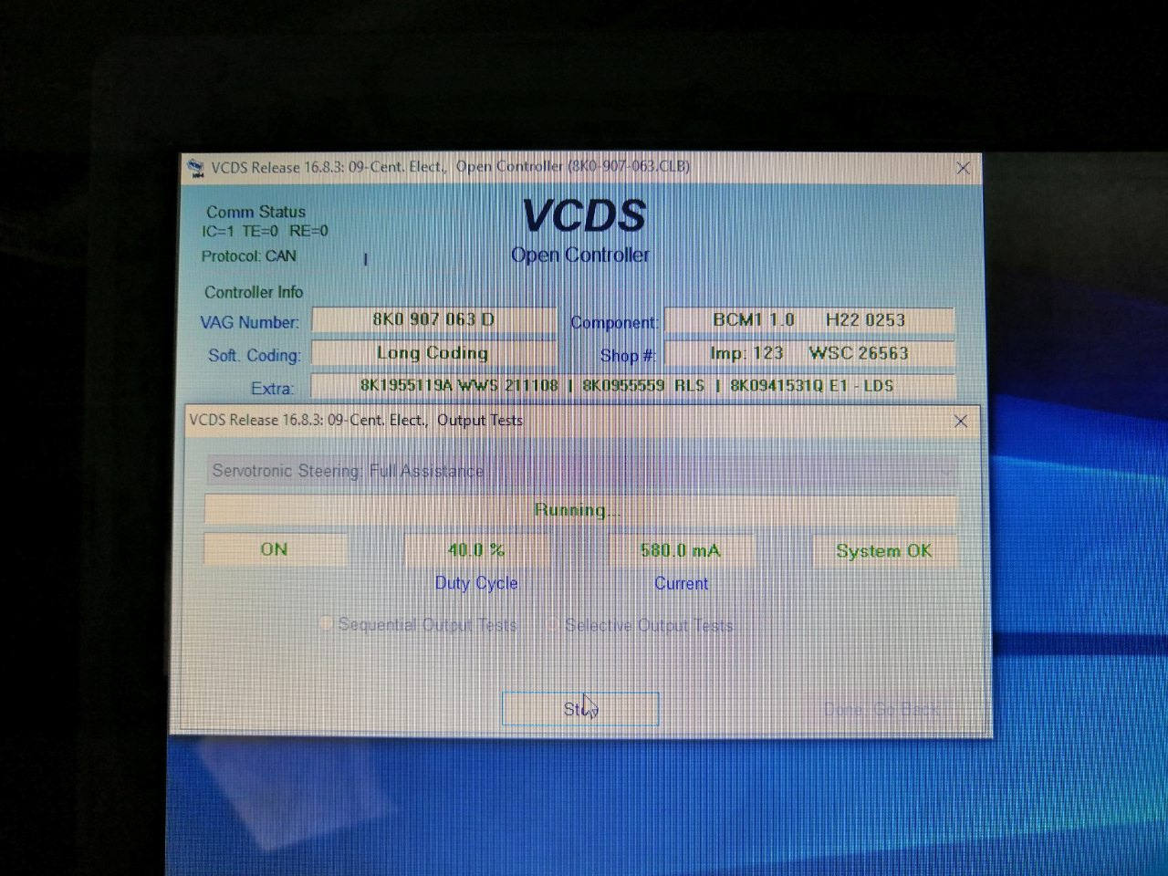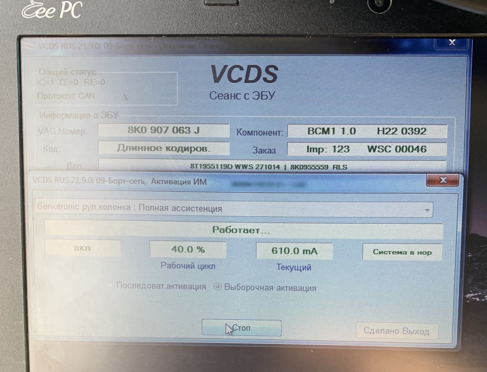 Нажимаем "Активация" и видим результат тока: 0.796А прыгает до 0.808А (Система в НОРМЕ) СЕРВОТРОНИК — Работает (Руль мягкий — легкий).