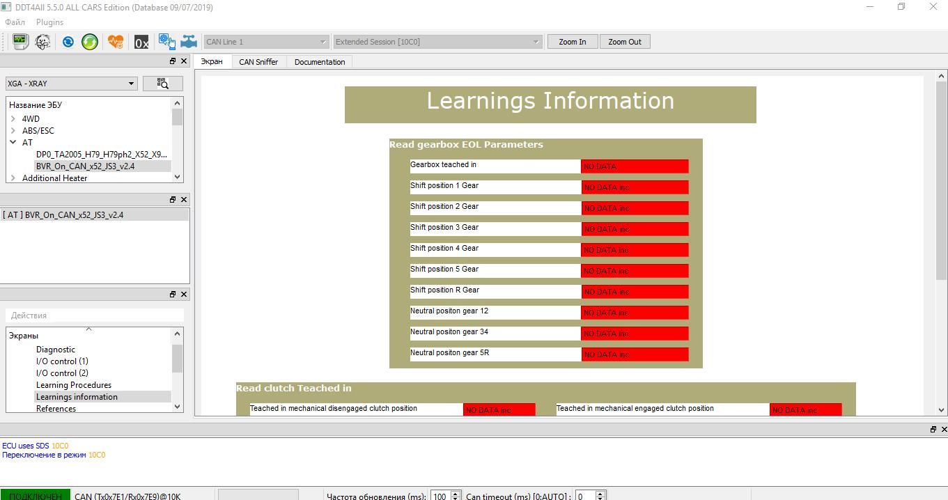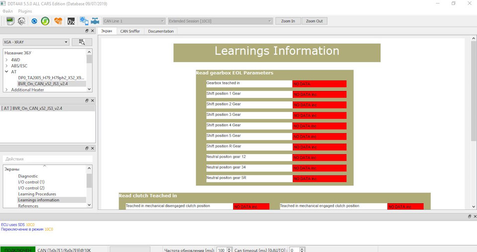 4. Заходим в Learning Procedures. И обучаем то что вам нужно. Как долго обучается- я не знаю. Зелёная процедура проходит- её слышно(актуатор двигается). Оранжевая- ставит все передачи, и заднюю тоже, поэтому жду побольше, и нажимаю стоп. Синюю процедуру лучше выполнять не сразу после запуска двигателя, а немного погодя. Чтобы частота вращения первичного вала обнулилась. После каждой процедуры требуют выключать зажигание, ждать минутку-другую, и переходить дальше. В какой последовательности делать- не подскажу. Я смотрел ТИ3100.25100.12055 и проводил адаптацию по их указаниям.